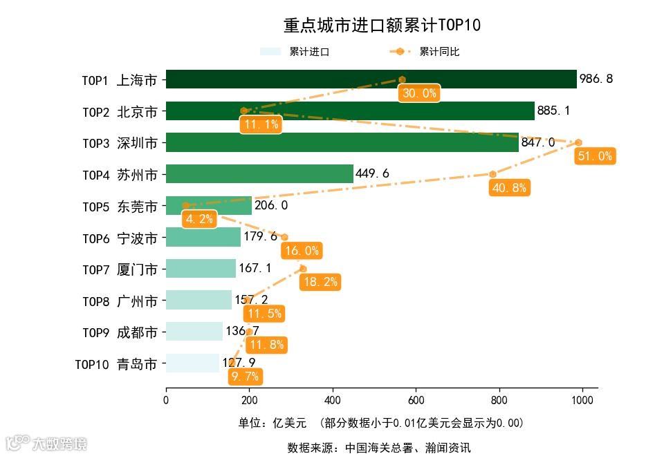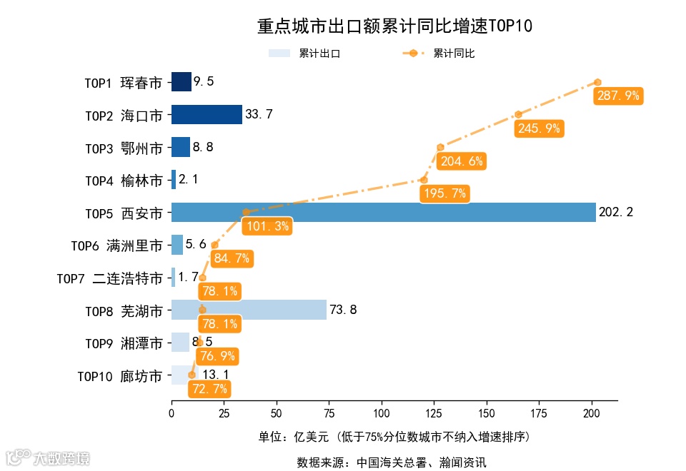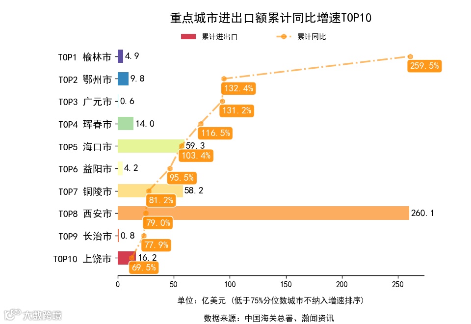 前3月,全国128个重点城市中,累计出口额同比增长的有91个市,下降的有37个市。增长最高是珲春市,出口9.5亿美元,累计同比287.9%。累计进口额同比增长的有99个市,下降的有29个市。增长最高是广元市,进口0.6亿美元,累计同比1421.7%.