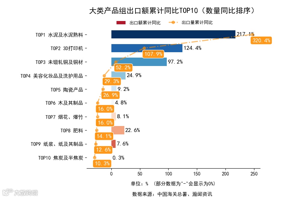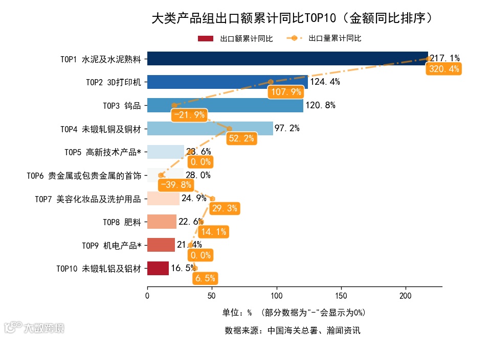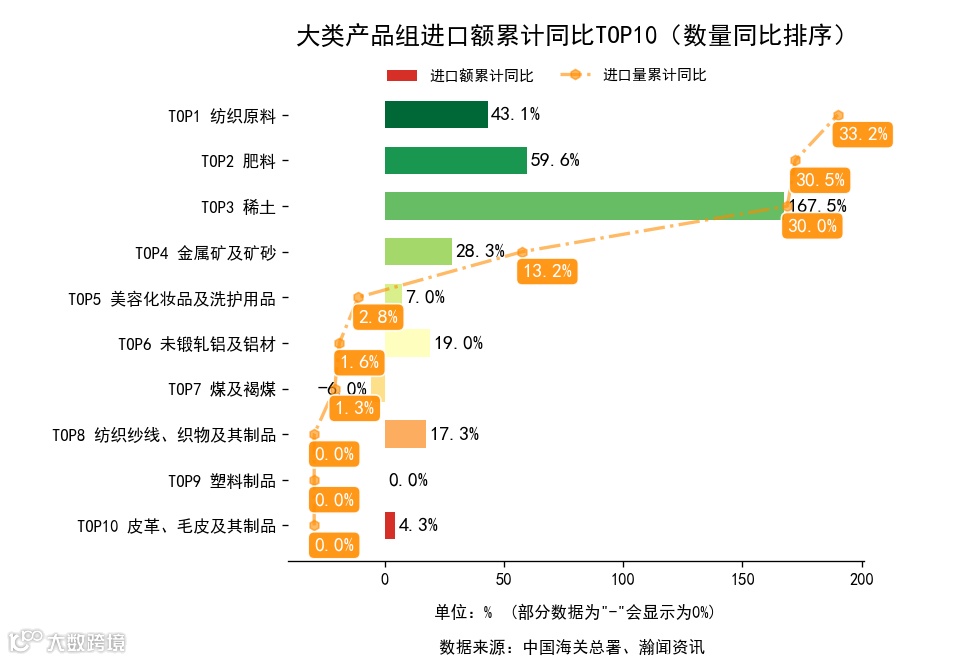 前3月,大类产品组中,出口金额累计同比增长的有32个,下降的有12个。增长最高的是水泥及水泥熟料,出口2.3亿美元,金额累计同比217.1%。进口金额累计同比增长的有19个,下降的有9个。增长最高的是稀土,进口7.0亿美元,累计同比167.5%。