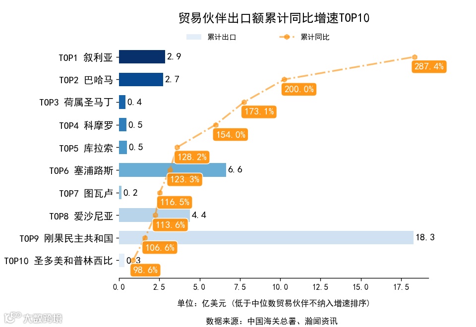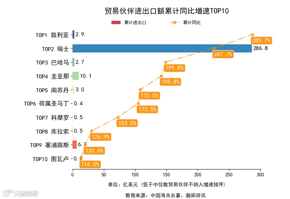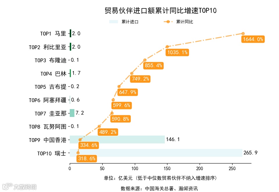 前3月,全国251个贸易伙伴中,累计出口额同比增长的有197个,下降的有54个。增长最高是叙利亚,出口2.9亿美元,累计同比287.4%。累计进口额同比增长的有172个,下降的有79个。增长最高是马里,进口2.0亿美元,累计同比1644.0%。
