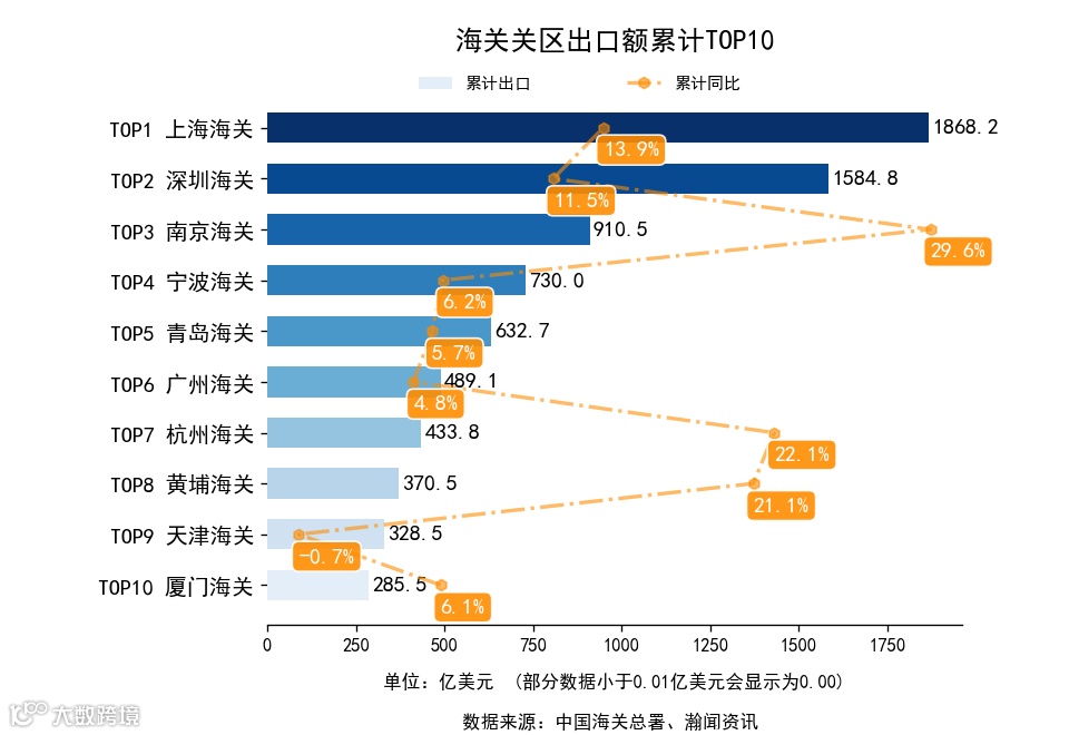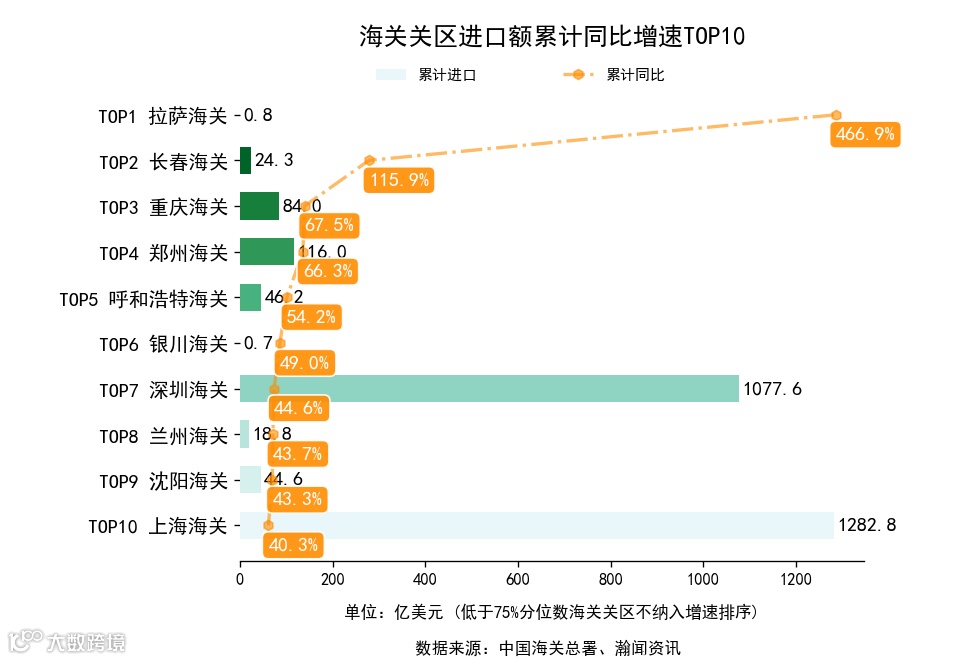 前3月,全国42个海关关区中,累计出口额同比增长的有36个,下降的有6个。增长最高是西宁海关,出口0.7亿美元,累计同比815.3%。累计进口额同比增长的有34个,下降的有8个。增长最高是拉萨海关,进口0.8亿美元,累计同比466.9%.