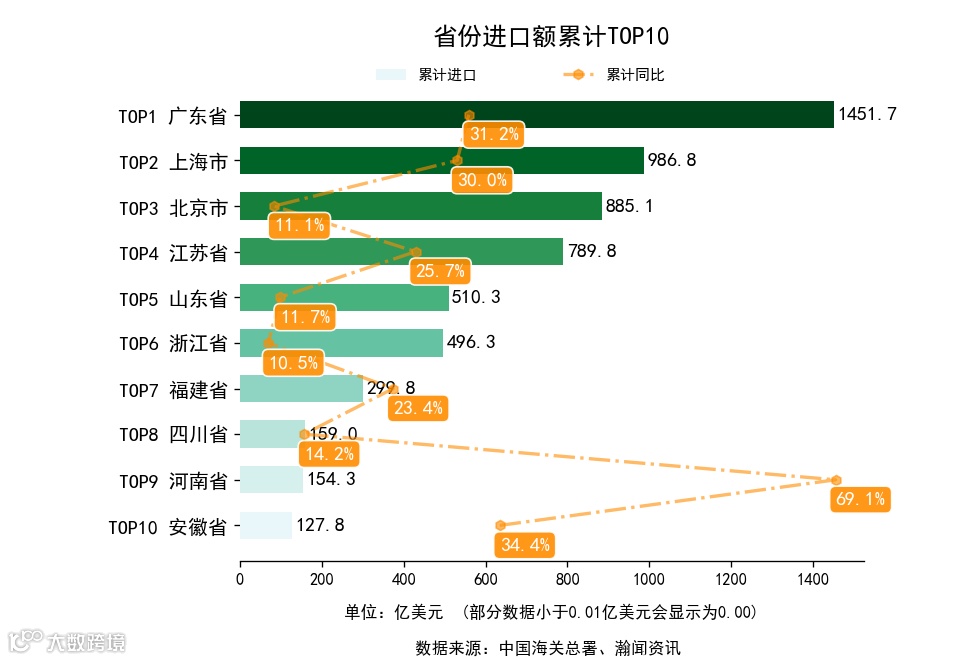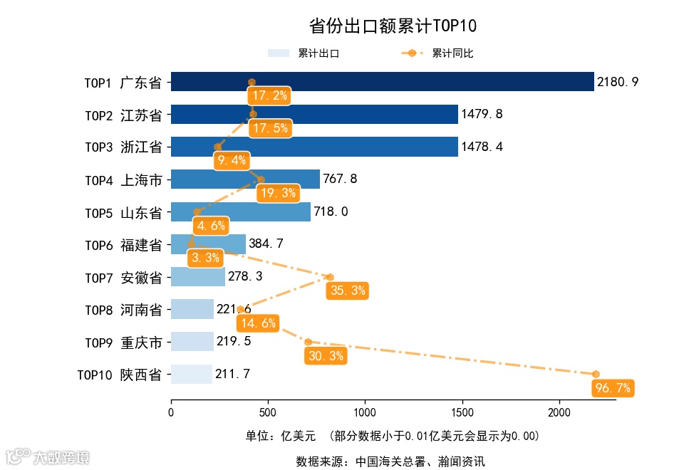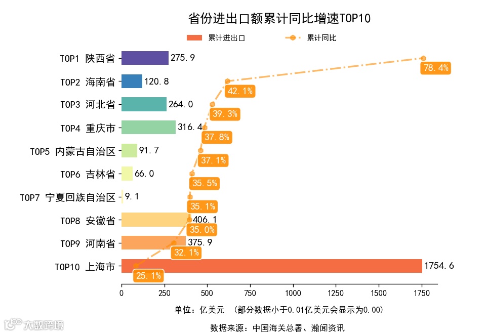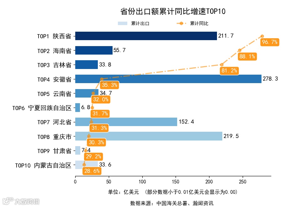 前3月,全国31省市(不含港澳台,下同)中,累计出口额同比增长的有26个省市,下降的有5个省市。增长最高是陕西省,出口211.7亿美元,累计同比96.7%。累计进口额同比增长的有27个省市,下降的有4个省市。增长最高是西藏自治区,进口1.1亿美元,累计同比116.7%。