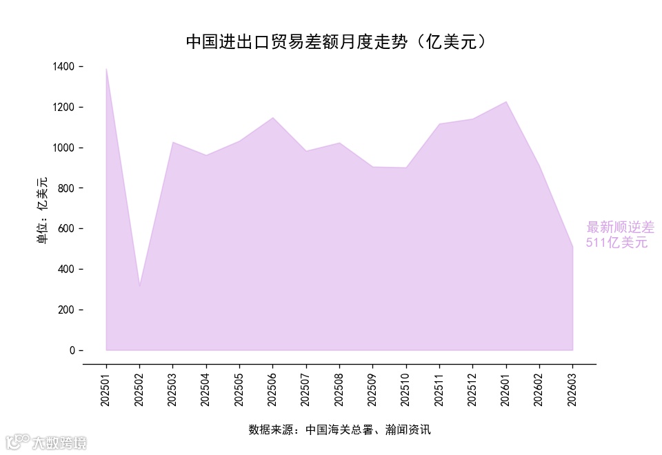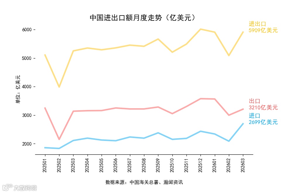 3月单月,进出口5909亿美元,同比增长12.7%,环比增长16.1%。其中,出口3210亿美元,同比增长2.5%,环比增长7.1%;进口2699亿美元,同比增长27.8%,环比增长29.1%。