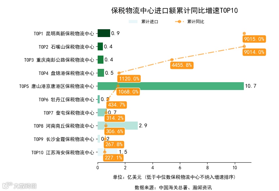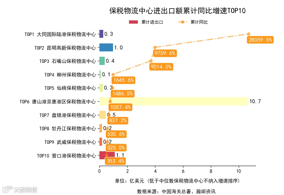 前3月,全国74个保税物流中心中,累计出口额同比增长的有46个,下降的有28个。增长最高是柳州保税物流中心,出口0.1亿美元,累计同比1645.6%。累计进口额同比增长的有44个,下降的有30个。增长最高是昆明高新保税物流中心,进口0.9亿美元,累计同比9015.0%.