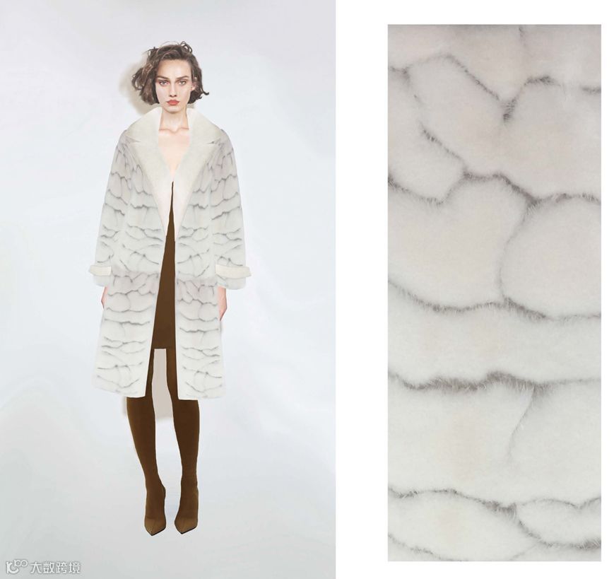 这捆购买于2017年6月拍卖会的珍珠米天鹅绒母皮金牌皮将会被制作成一件长款大衣,她将裁剪后的皮草条和皮革面料结合,营造出白雪皑皑的工艺效果。