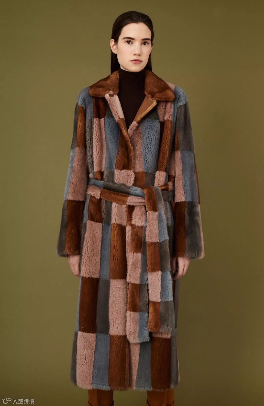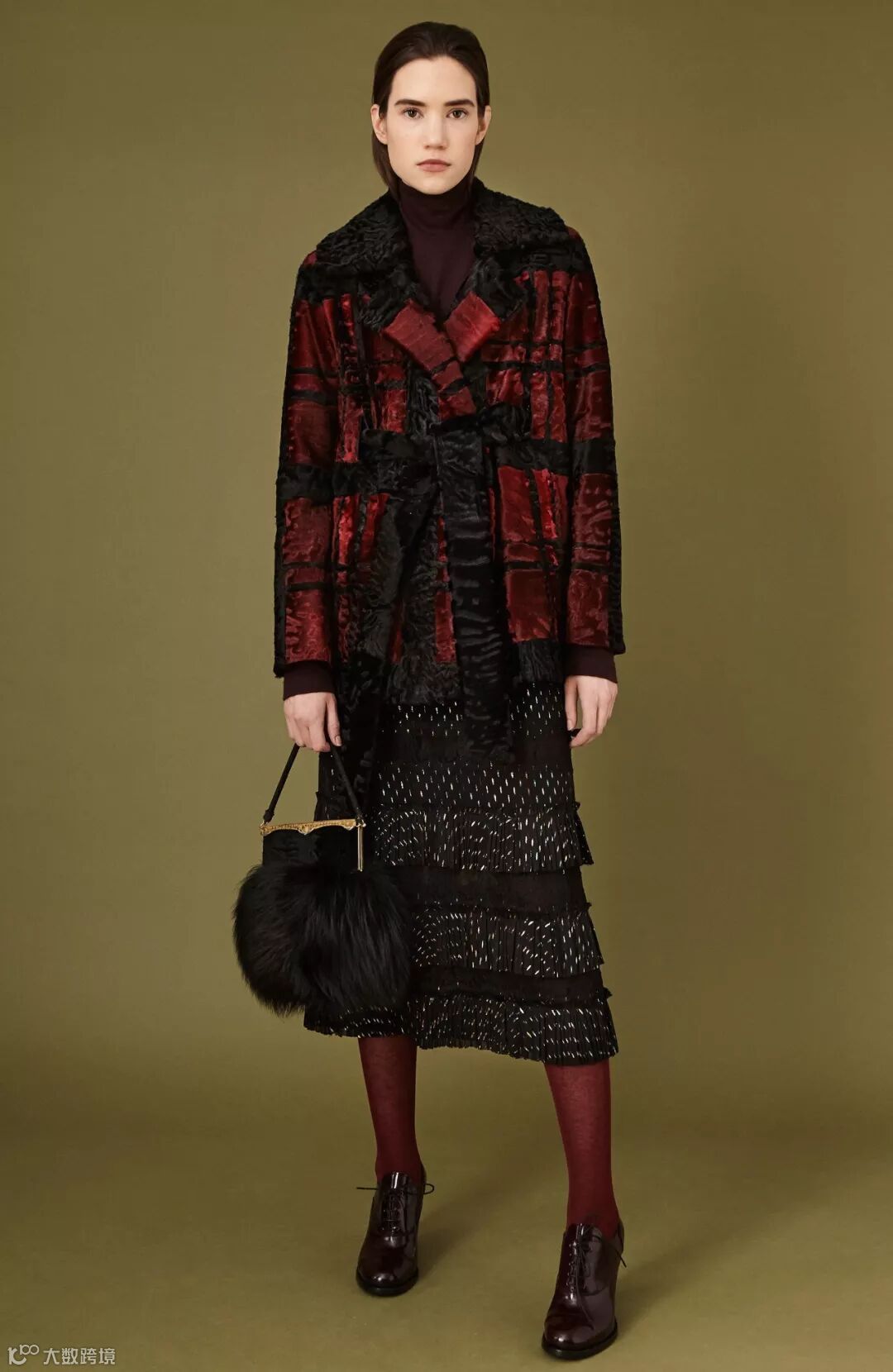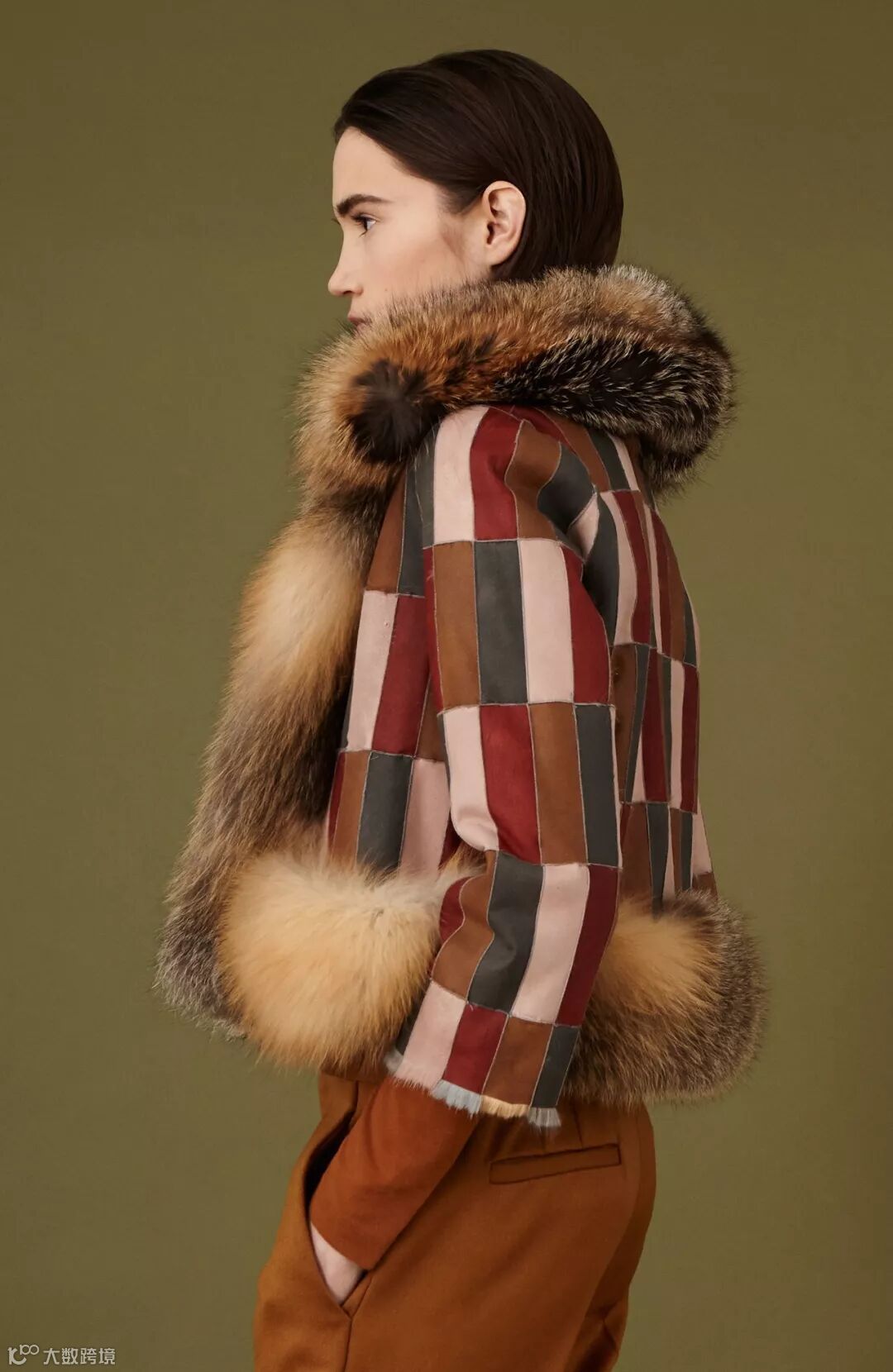 ▲几何方块图案面料为皮草设计带来灵感,这种面料可以与毛皮拼接使用,也被制作成与皮草服装搭配的单品