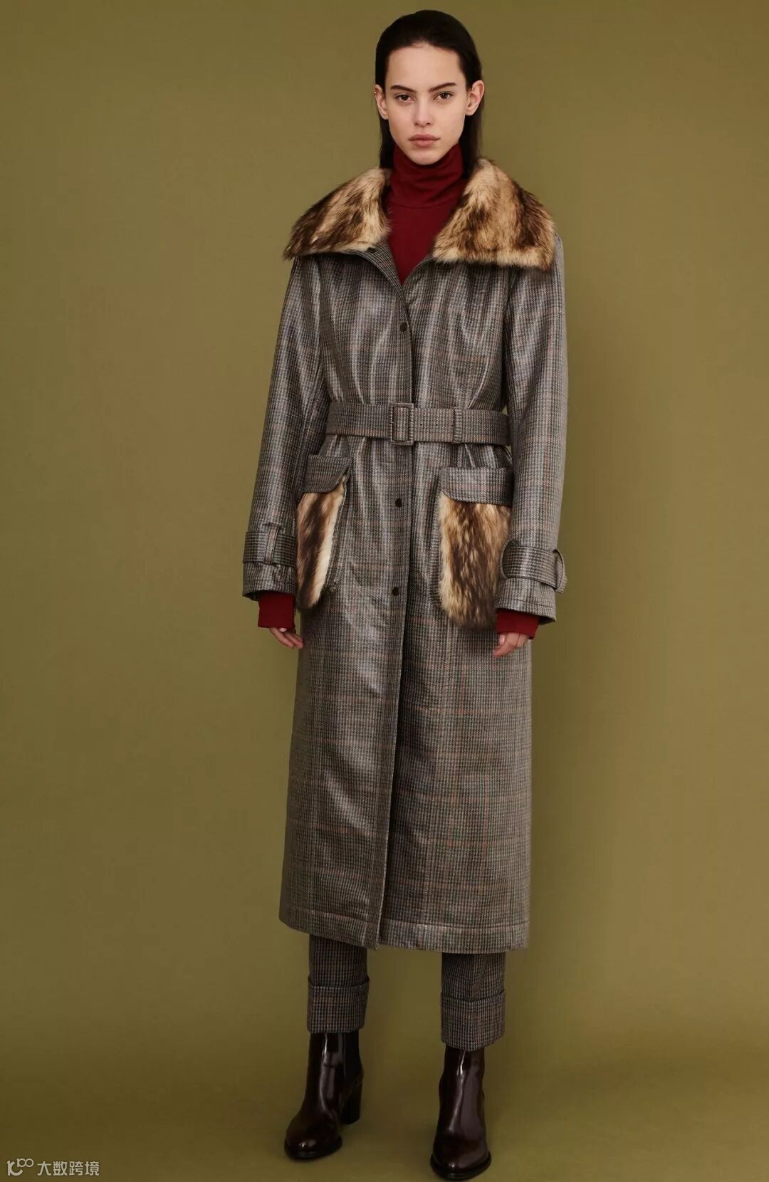 ▲紫貂以传统的排头式的拼接手法,做成立领中长款大衣,在门襟处以横排的手法做出波浪感用以装饰。搭配时下流行的细格纹毛呢西裤和切西尔短靴,实用干练