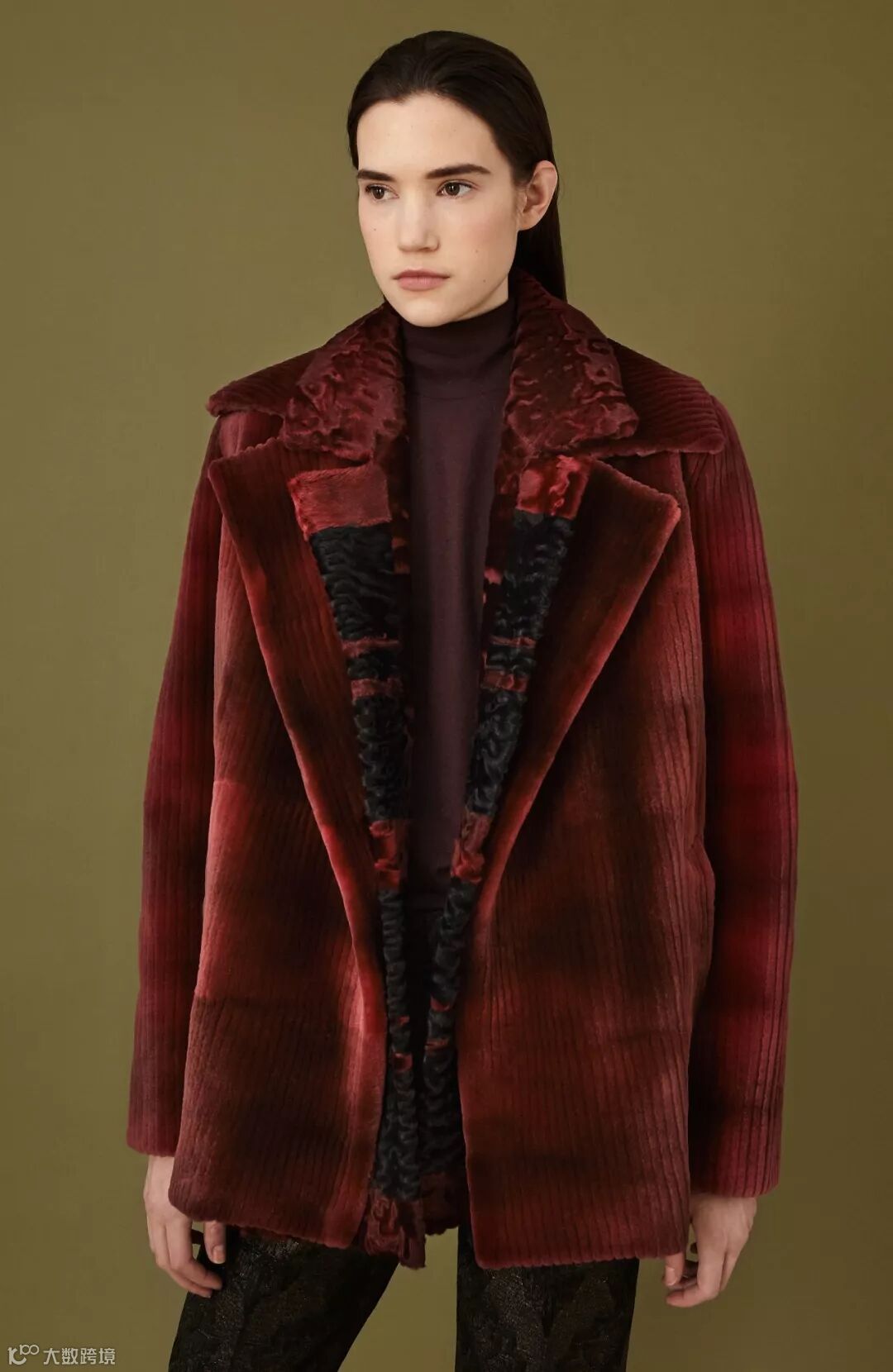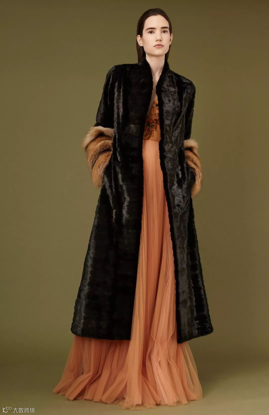 ▲黑色水貂以传统的横排手法加工,整体线条流畅,彰显出顶级毛皮本身的光泽和质感。袖口处饰以狐狸毛
