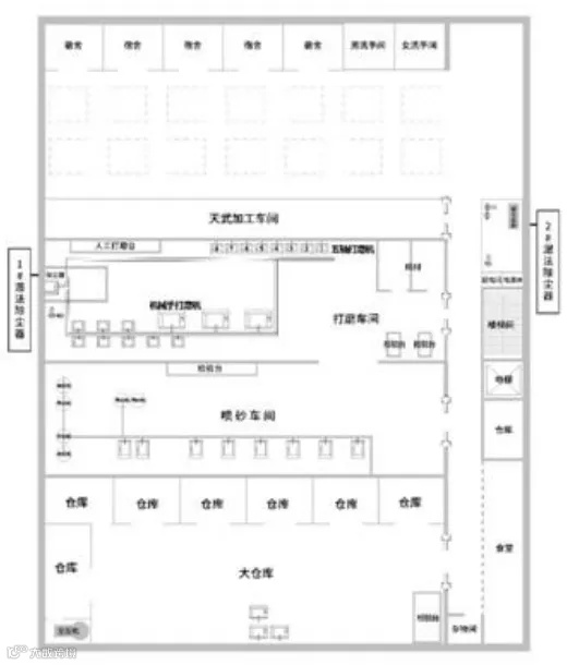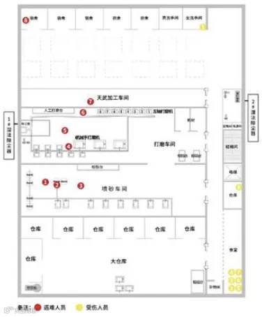 事发区域位于1号楼四层。燊荣公司在此设有仓库、喷砂车间、打磨车间和食堂,四层最北侧为天武金属公司的闲置加工车间和宿舍。