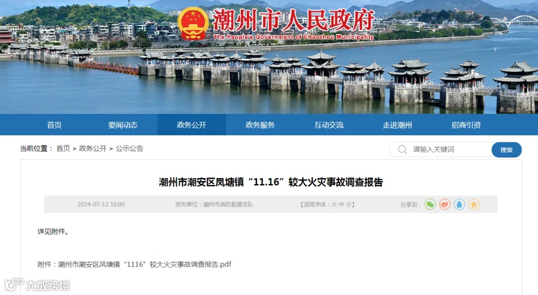 潮州市人民政府网站公布了《潮州市潮安区凤塘镇“11·16”较大火灾事故调查报告》
