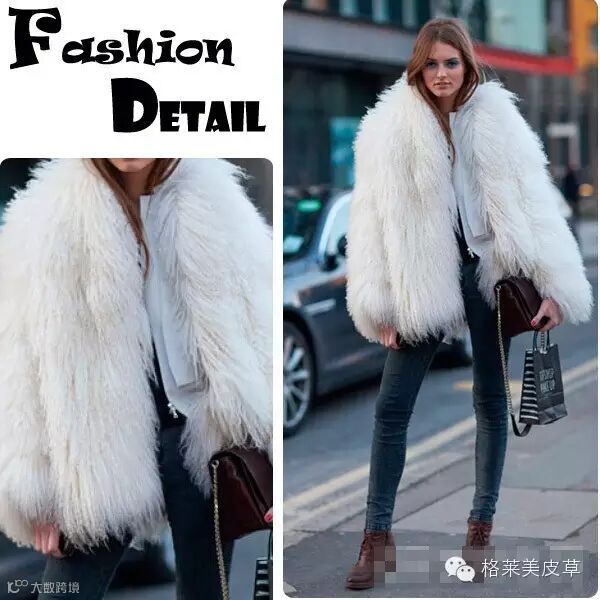 搭配点评:白色衬衫搭配紧身裤,休闲又显瘦,再配上一件温暖的白色皮草外套,奢华又显腿长。