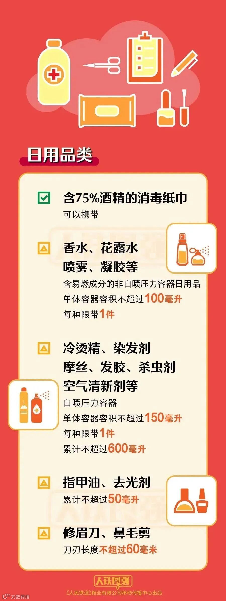 ● 携带染发剂、杀虫剂等自喷压力容器的,单体容器容积不得超过150毫升,每种限带1件,且累计不超过600毫升。