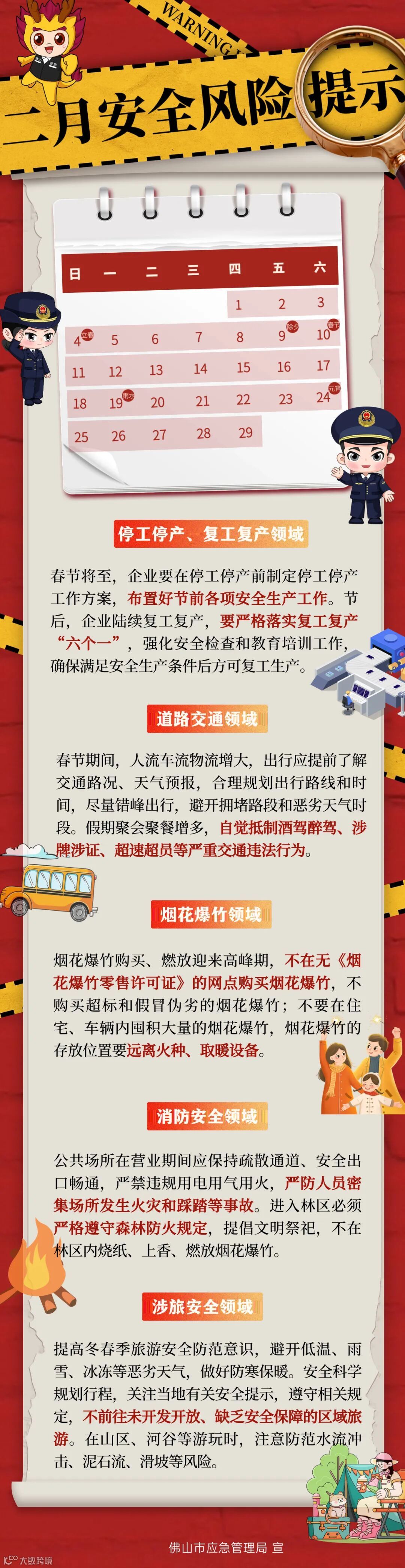 2月份,面临节前停工停产和节后企业集中复产复工,安全生产工作面临严峻挑战。同时适逢春节假期,群众出行、聚集性活动增多,人流、物流、车流密度增大,加之低温天气等不确定性因素交织,安全风险复杂多变,现对2月突出安全风险提示如下。