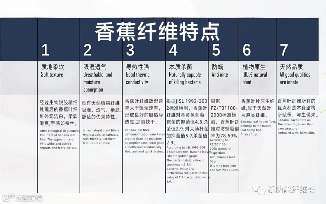 新功能纤维荟 香蕉纤维具有轻柔、光泽好、吸湿放湿性好、透气性强、抗菌性强、易降解且环保等特点,特别适合在高档内衣、时尚女装、婴幼童装、家居家纺、T恤衫及针织毛衣等领域应用。