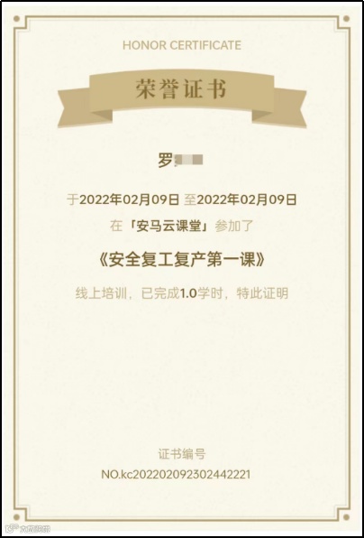 今年参加线下培训班的,无论是新考证或者复审,只需在安马云小程序上看67分钟的复工复产课,即:2022年“安全复工第一课”,其他的视频不用看,操作步骤及凭证样板如下图: