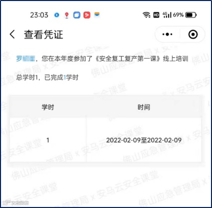 今年参加线下培训班的,无论是新考证或者复审,只需在安马云小程序上看67分钟的复工复产课,即:2022年“安全复工第一课”,其他的视频不用看,操作步骤及凭证样板如下图: