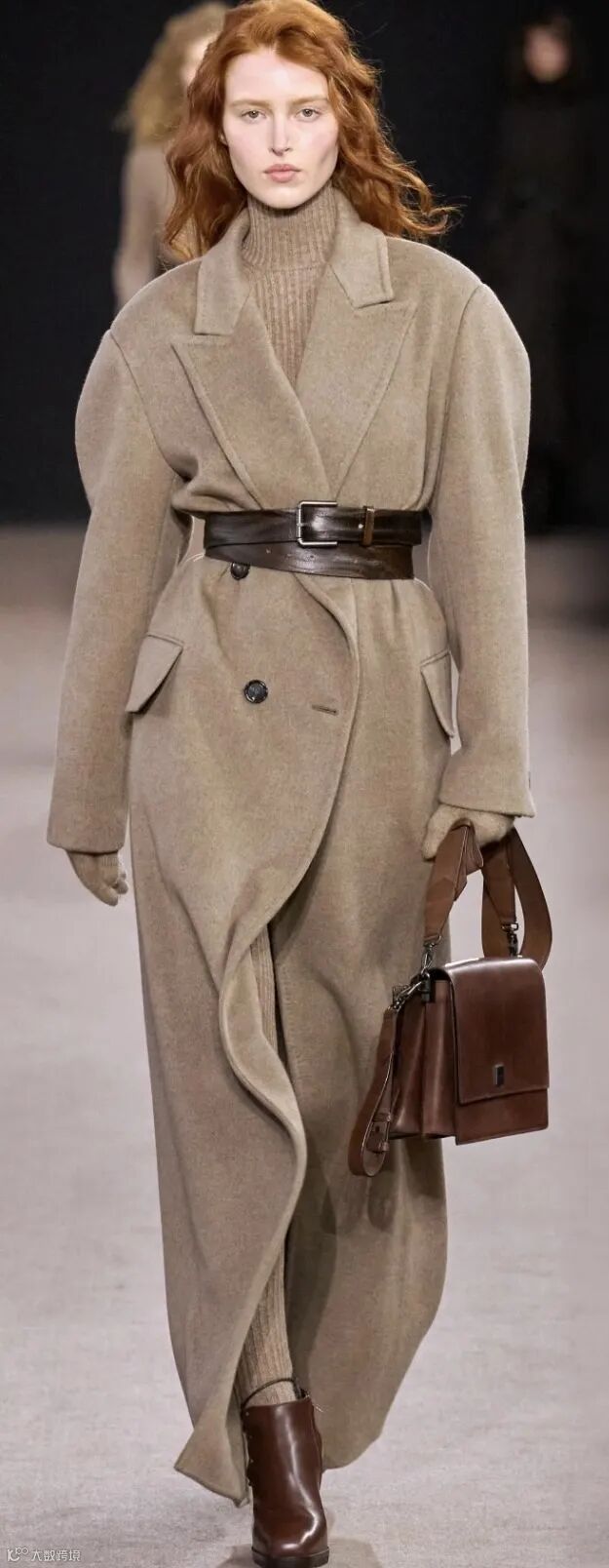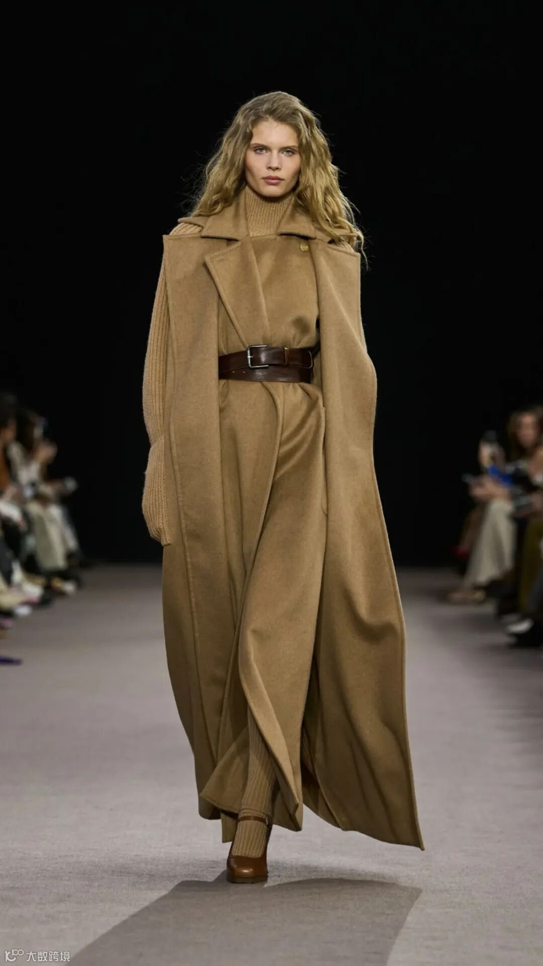 作为“美拉德风”的核心,奶咖色的羊绒大衣层叠搭配,营造出温暖、复古而又充满层次感的秋冬造型。奶咖色传递着毫无攻击性的亲和、甜美与治愈感,如同是冬日里一杯热饮所带来的身心慰藉。