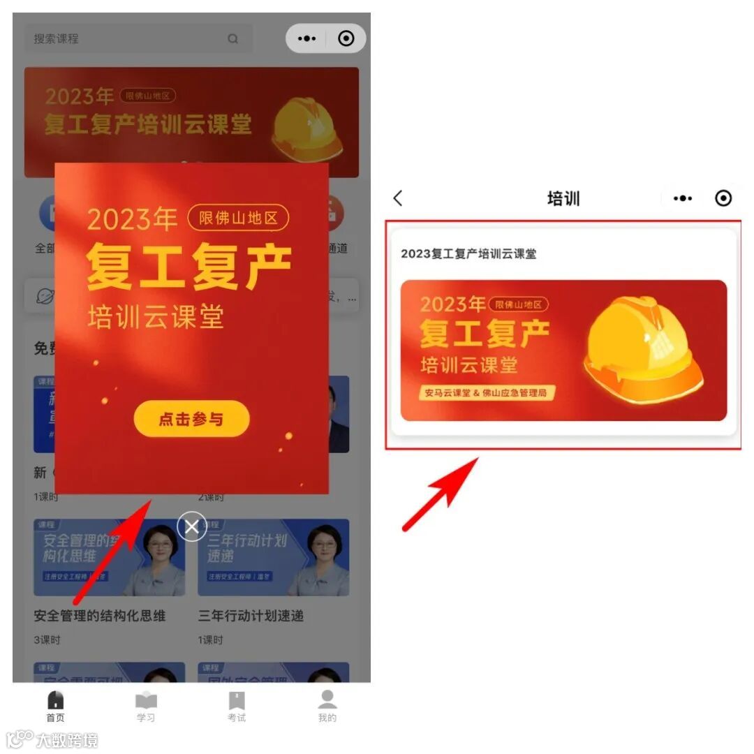 在【安马云课堂】小程序首页,点击首页海报或政企通道,进入复工复产专区。