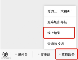 点击“佛山应急管理”微信公众号菜单栏【查找服务】,然后再点击【线上培训】,进入小程序。