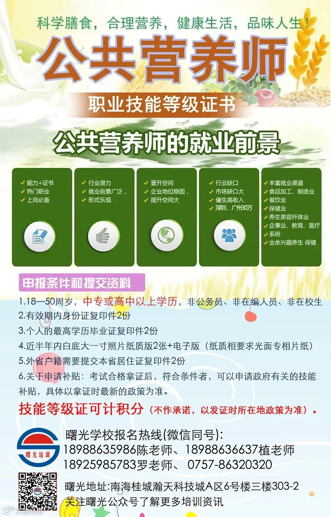 公共营养师我国现时的营养专业人才十分紧缺,公共营养师的就业前景非常广阔,可以针对健康和亚健康人群做营养咨询、指导工作。不仅可以在社区发挥重要作用,还可为企业员工、白领、高级管理人员、运动员、家庭提供教育、辅导、指导等服务。在提升自己的营养知识与技能的同时,符合条件者还可以申请政府相关的技能补贴,享受关于入户入学的积分加计(积分不作承诺,以发证时所在地的政策为准)。