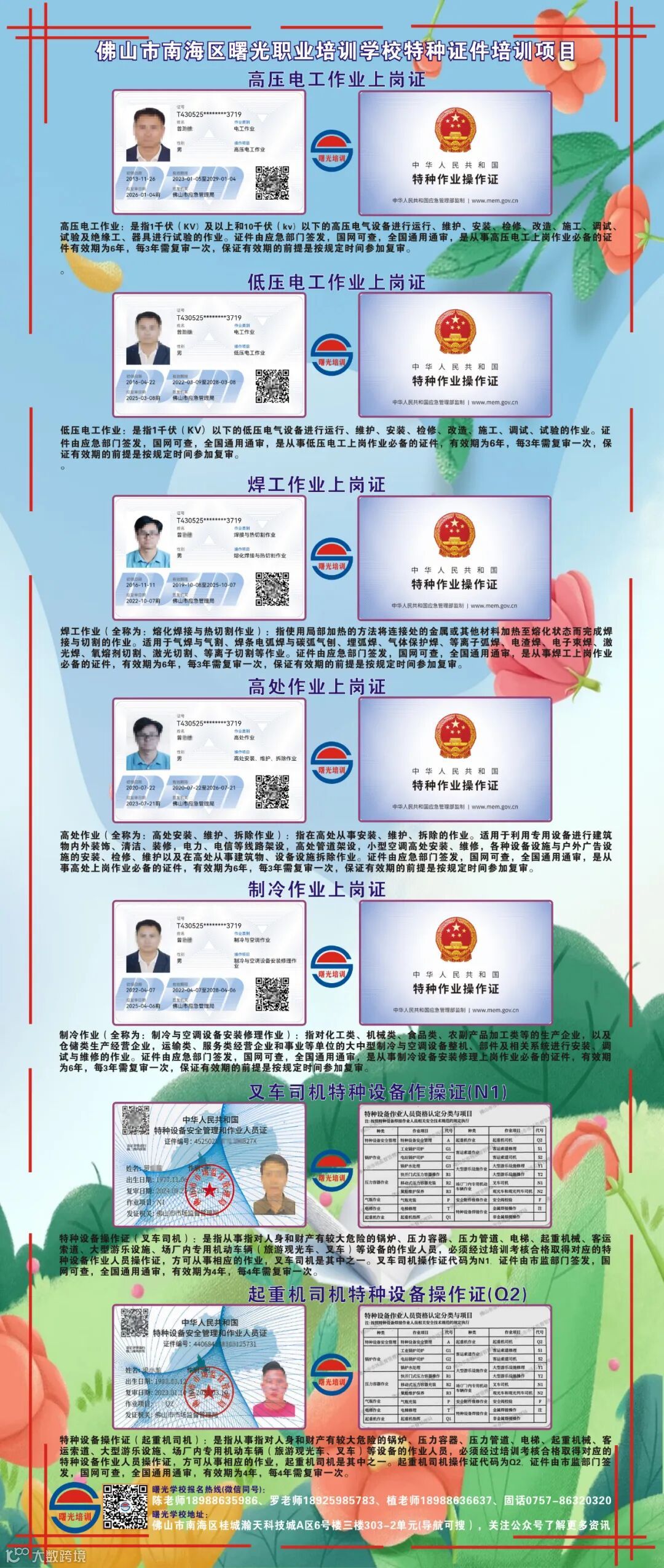 曙光学校可以开展包括高压电工、低压电工、焊工作业、高处作业、制冷作业等特种作业工种上岗操作证的新考及复审培训,特种设备常用的叉车司机、起重机司机、特种设备安全管理员等特种设备操作及管理证件的新考及复审培训。