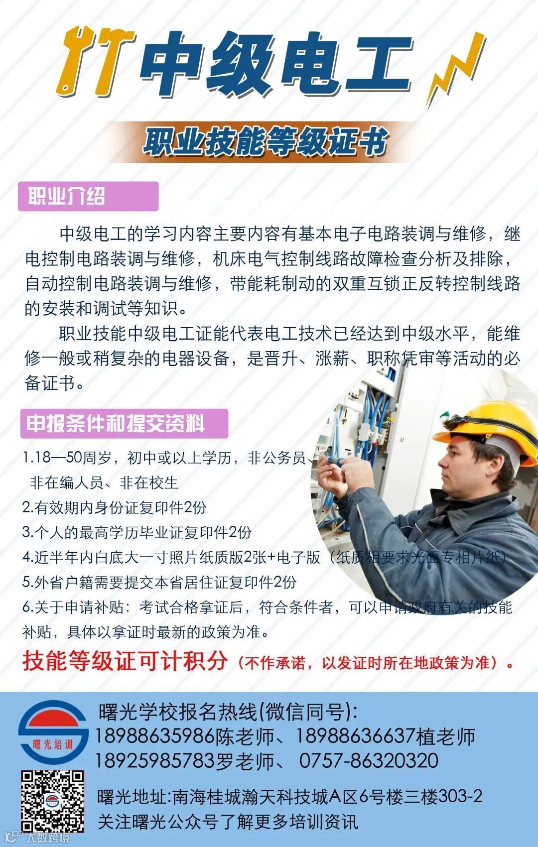 中级电工是从事电工岗位职业的从业人员提升自我、证明自身工作能力的必备证书。通过线路控制进阶和PLC的基础知识学习后,自己后期再不断学习融会贯通再提升。在学习业务知识与技能的同时,符合条件者还可以申请政府相关的技能补贴,享受关于入户入学的积分加计(积分不作承诺,以发证时所在地的政策为准)。