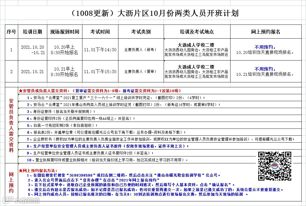 大沥片区10月份一般生产经营单位主要负责人的复审及新考证培训如下表所列,开班地点为:大沥成人学校二楼,请有需要的企业在开班当天早上9点前,直接过到现场报名交费培训即可,大沥不用预约。