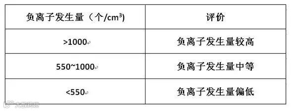 GB/T 30128-2014对样品负离子发生量作了评判标准,如下表所示。