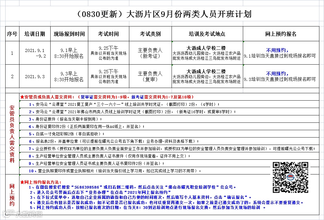 大沥片区的开班地点为大沥成人学校二楼(大沥沥西幼儿园旁边、大沥桂江农产品批发市场或大沥桂江三鸟批发市附近),大沥9月份一般生产经营单位安全管理人员、主要负责人的复审及新考证培训如下表所列,大沥的培训不需要预约,请在开班日期当天早上9点前,去到大沥成校现场报名交费培训即可。