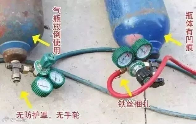 ▲气线应为红色,施工现场同类气瓶数量不得超过5支,无防护圈,无防倒设置,安全附件不全。
