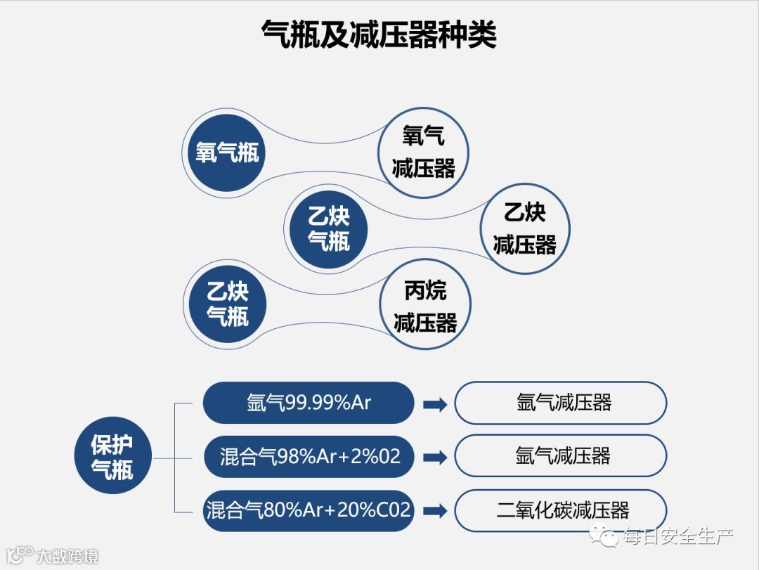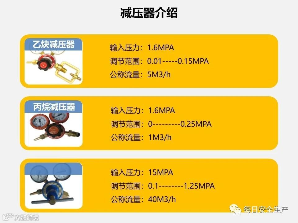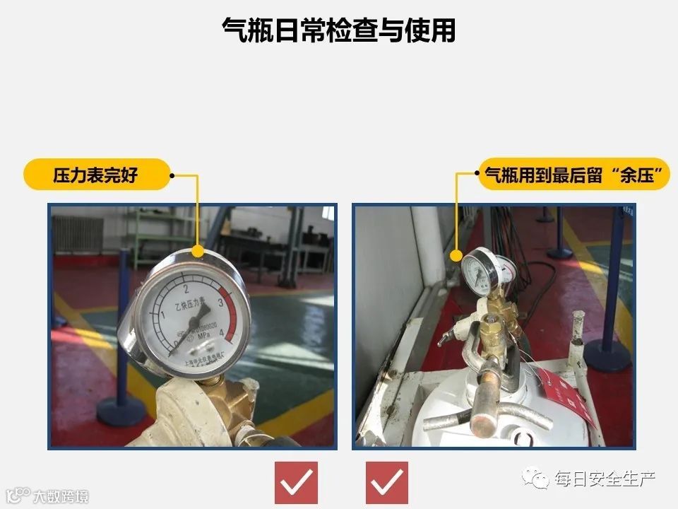 因为乙炔的爆炸极限很低,稍为混有一点空气,达到一定温度就会爆炸。所以乙炔瓶的排气口一定要有减压阀,防止空气混入瓶中,要不然下次使用就有爆炸的危险。加上减压阀,就是要防止瓶里的气压小于外界空气的气压,避免空气倒流到乙炔瓶中,氧气钢瓶应保留不小于 0.098~0.196MPa 表压的剩余压力。乙炔钢瓶应保留冬季 49Kpa~98KPa,夏季 196KPa 表压的剩余压力。