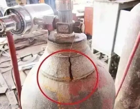 ▲CO2气瓶颈破裂,钢印模糊不清,怀疑使用残废瓶,可能造成容器爆炸事故。