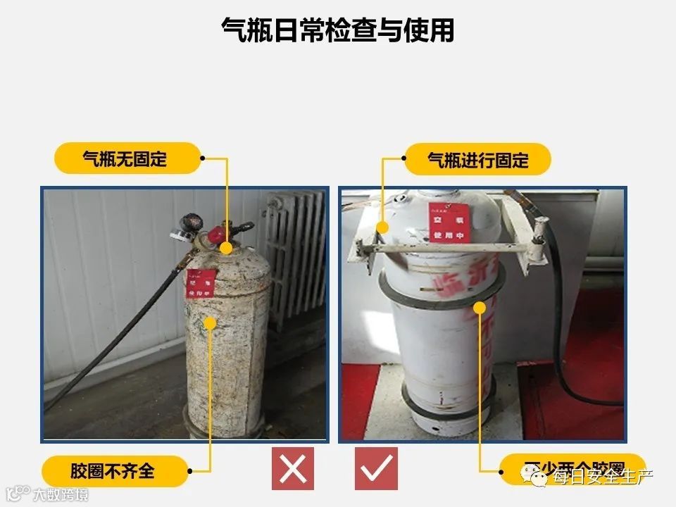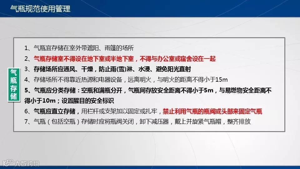 2.气瓶不得靠近热源和电器设备,夏季要有遮阳措施防止暴晒,与明火的距离要大于10米(高空作业时是与垂直地面处的平行距离)。