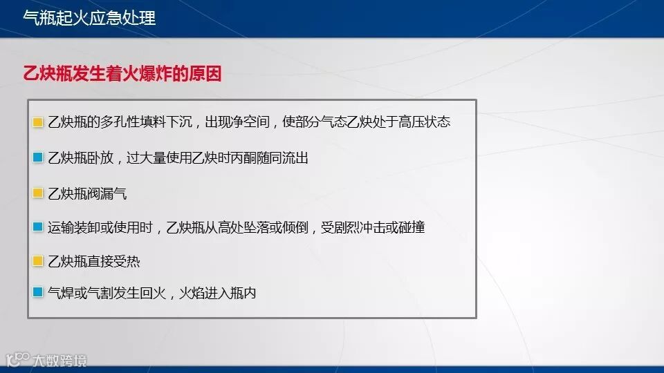 原因4:使用时乙炔瓶瓶阀上装有减压器、阻火器、连接有胶管,因卧放易滚动,滚动时易损坏减压器、阻火器或拉脱胶管,造成乙炔气向外泄放,导致燃烧爆炸。