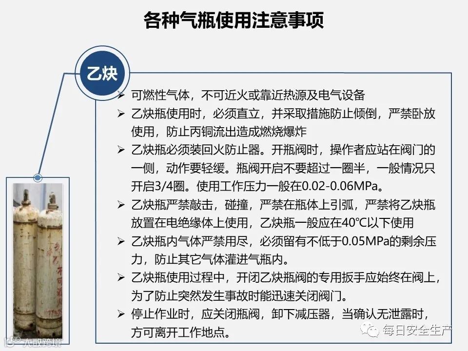 1.乙炔气瓶在使用时必须装设专用减压器、回火防止器,工作前必须检查是否好用,否则禁止使用,开启时,操作者应站在阀门的侧后方,动作要轻缓。