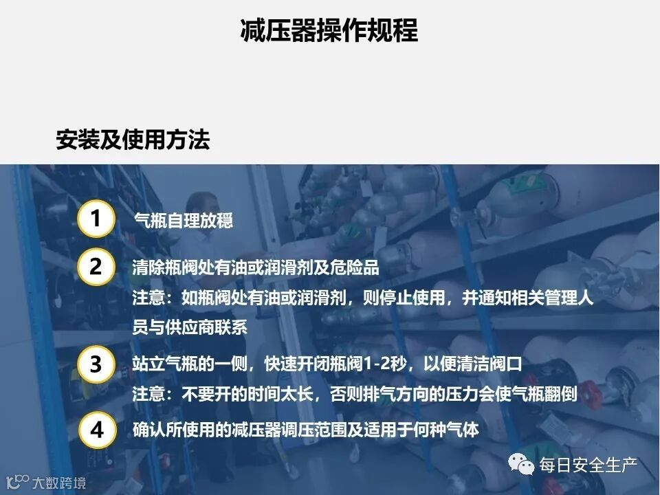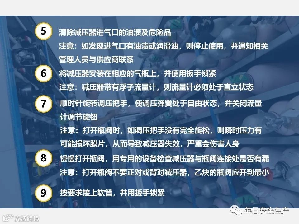 4.在开启瓶阀和减压器时,人要站在侧面;开启的速度要缓慢,防止有机材料零件温度过高或气流过快产生静电火花而造成燃烧。