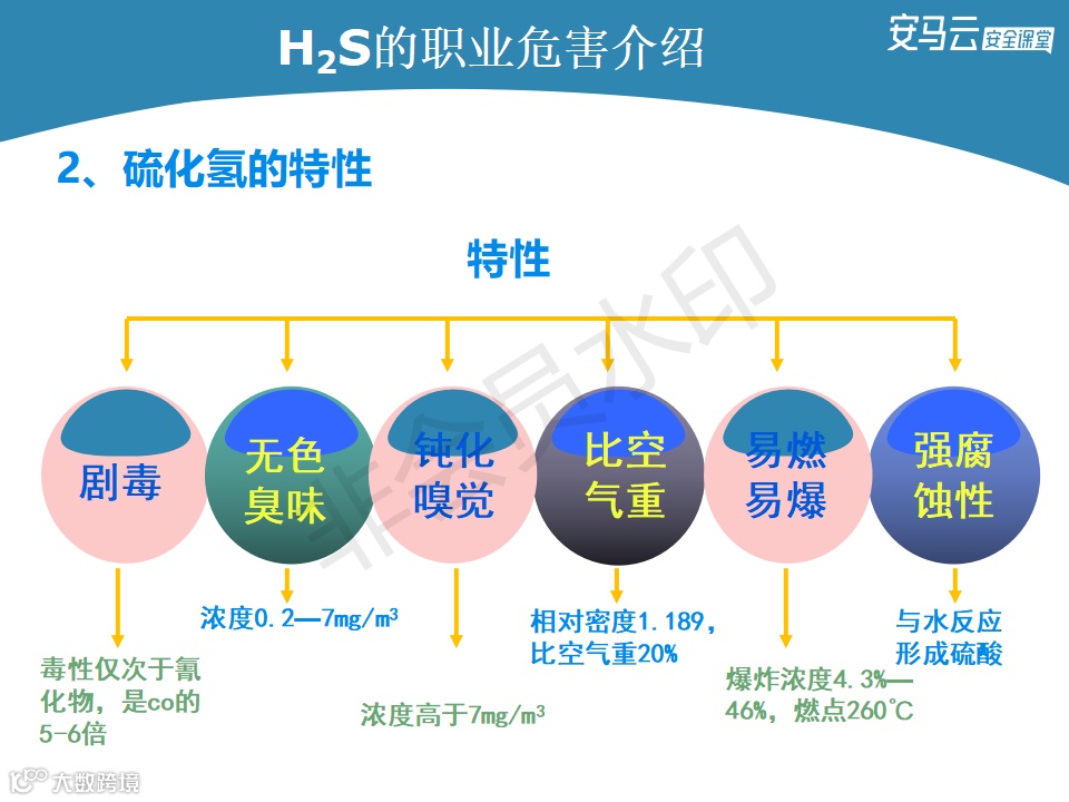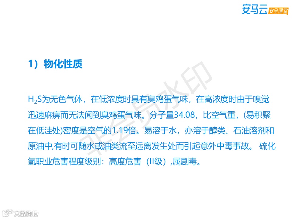 它无色、有强烈腐败臭鸡蛋气味,比空气重,易聚集在低洼处。