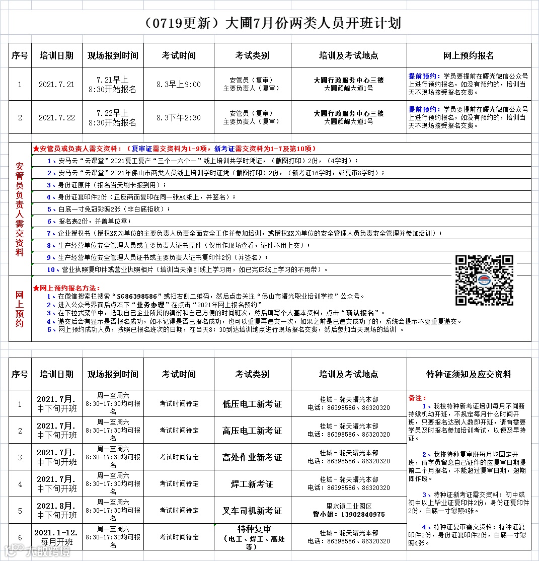 (0719更新)狮山镇大圃片区两类人员开班计划 佛山市曙安安全技术服务公司