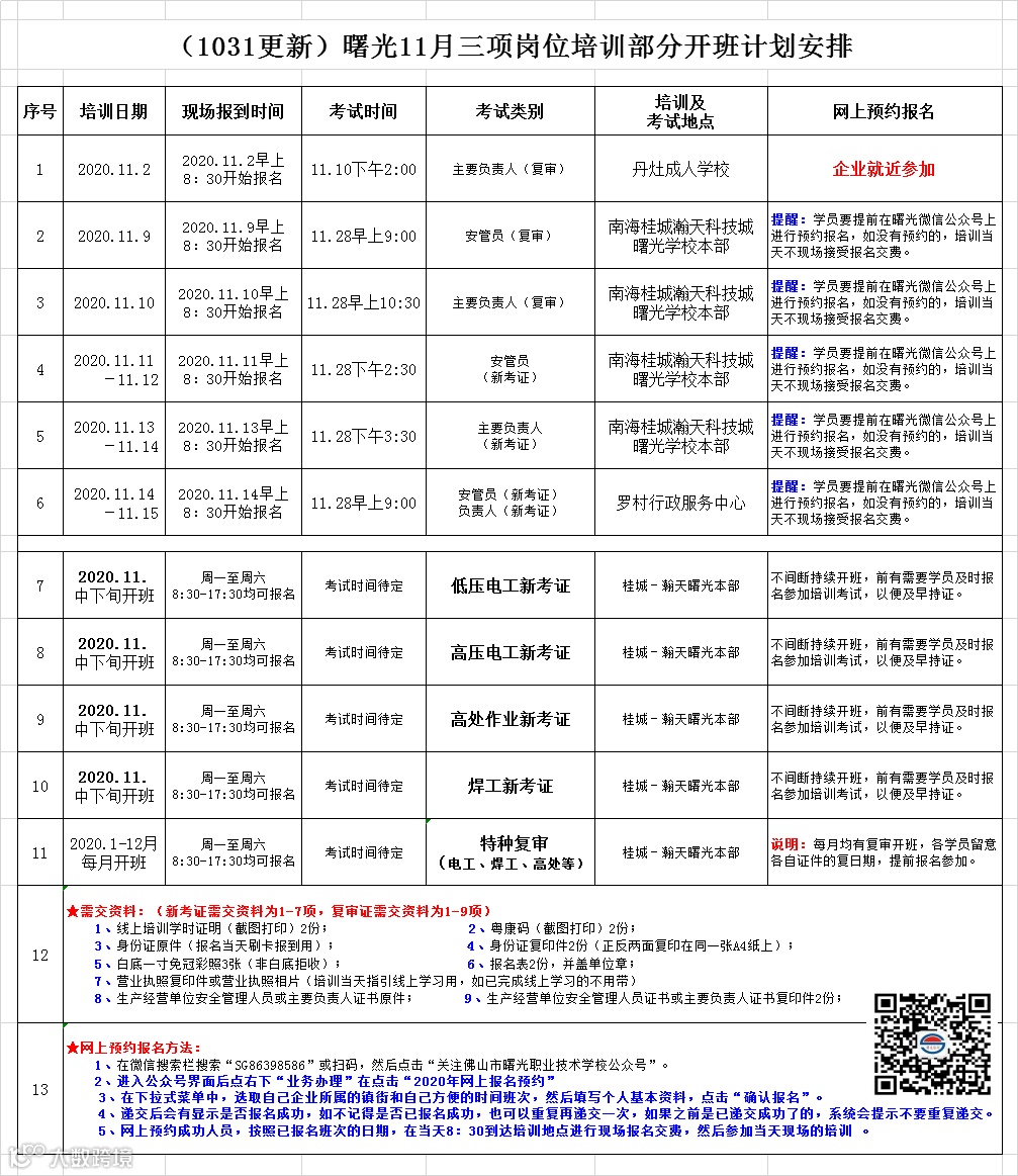 (1031更新)曙光11月三项岗位培训部分开班计划安排 佛山市曙安安全技术服务公司