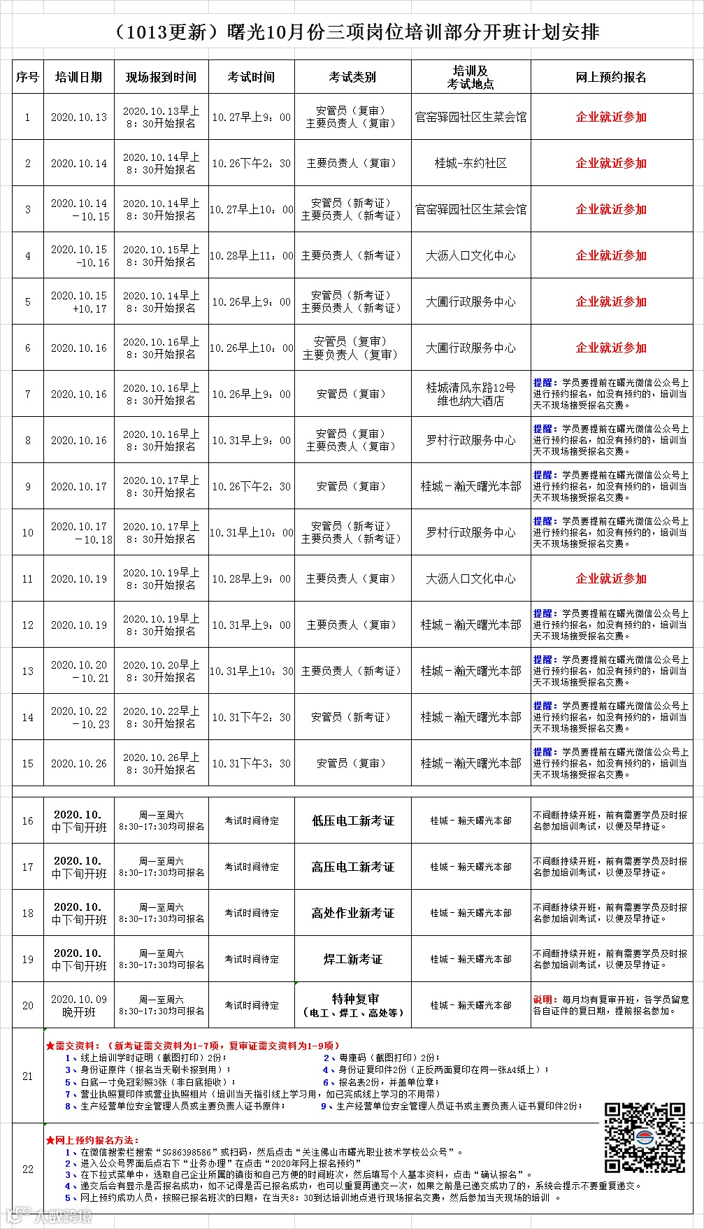 (1013更新-大圃有变动)曙光10月份三项岗位培训部分开班计划安排