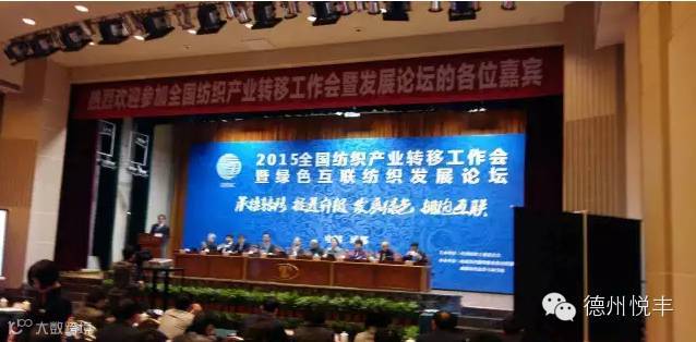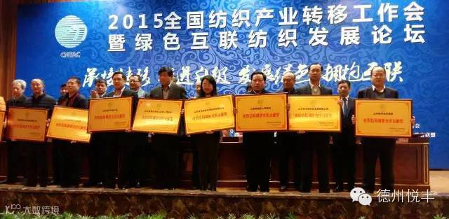 1月8日,2015全国纺织产业转移工作会暨绿色互联纺织发展论坛在成都召开,德州恒丰集团被授予“2015年度纺织结构调整突出贡献奖”荣誉称号,集团理事长苏建军上台领奖。