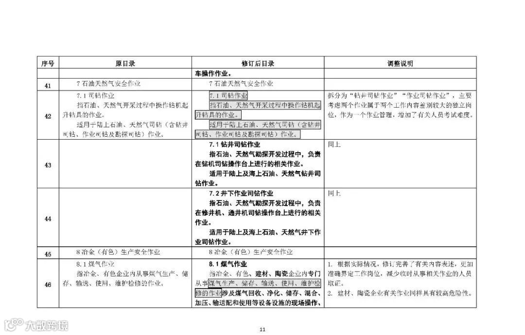 5.在石油天然气安全作业类别中,将原“司钻作业”拆分为“钻井司钻作业”和“作业司钻作业”2个操作项目,适用范围扩大至海洋石油、天然气司钻作业。