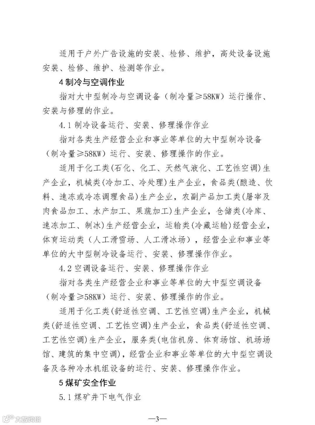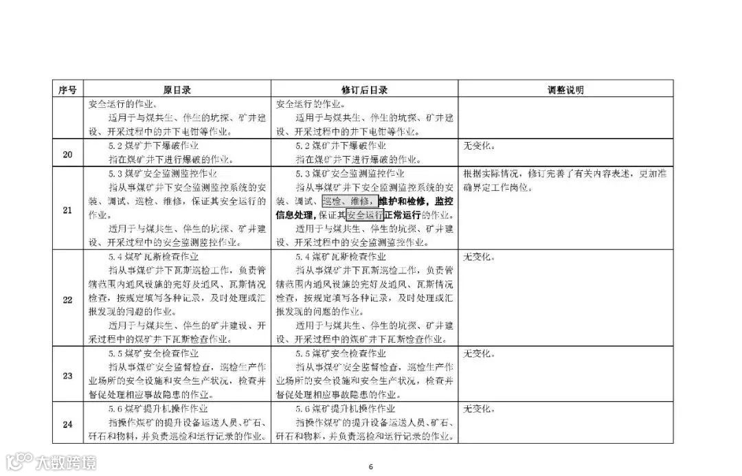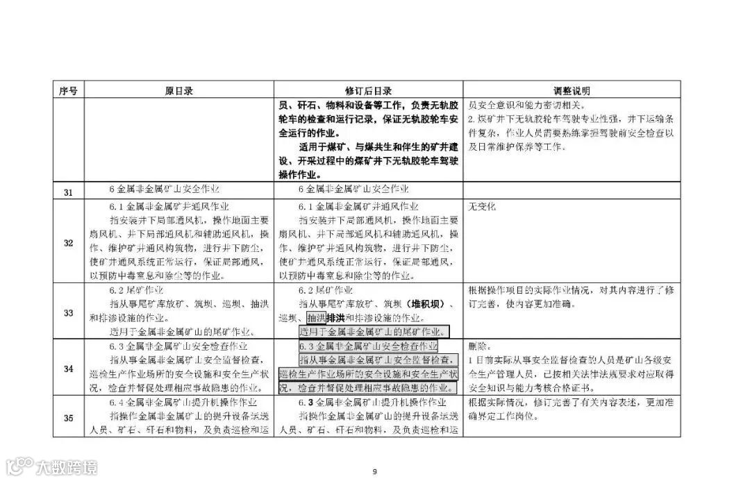 (四)规范了5个作业类别和9个操作项目的文字表述分别是电工作业、高处作业、制冷与空调作业、危险化学品安全作业、烟花爆竹安全作业5个作业类别;煤矿安全作业类别中的“煤矿安全监测监控作业”“煤矿防突作业”“煤矿探放水作业”3个操作项目;金属非金属矿山安全作业类别中的“尾矿作业”“金属非金属矿山提升机操作作业”“金属非金属矿山支护作业”“金属非金属地下矿山主排水作业”4个操作项目;烟花爆竹安全作业类别中的“烟火药制造作业”“黑火药制造作业”2个操作项目。