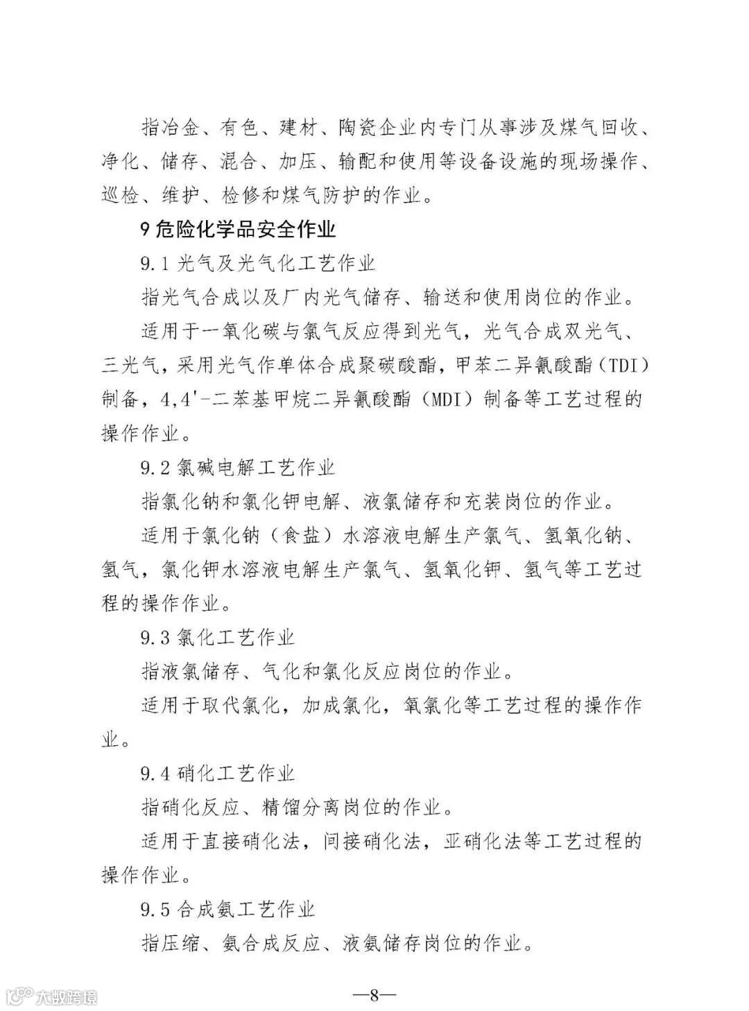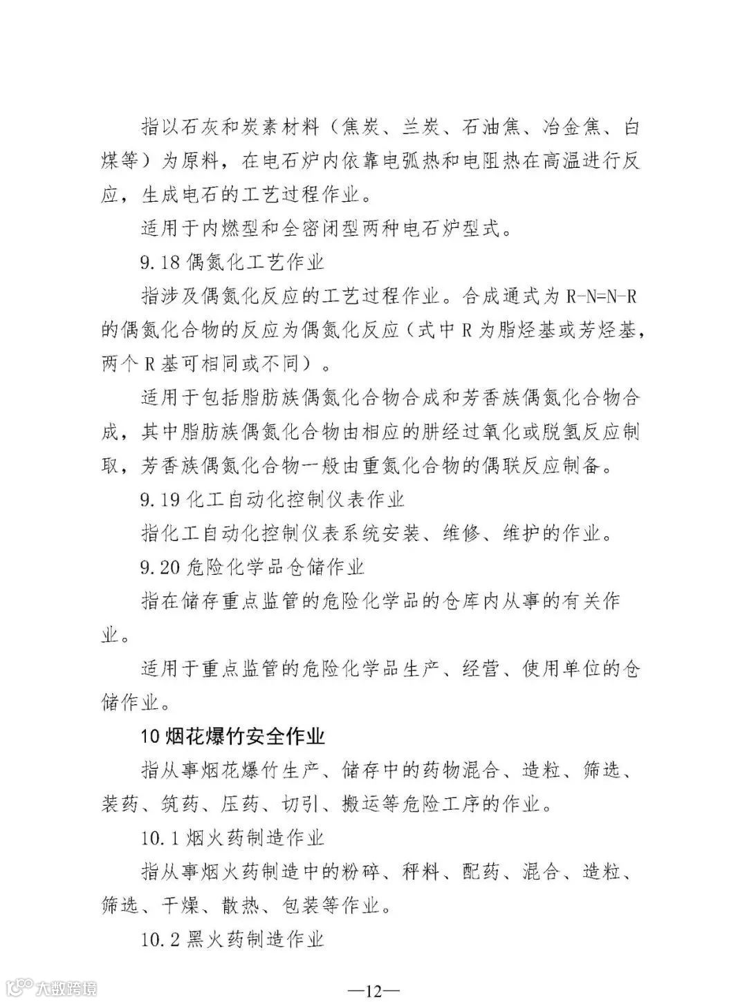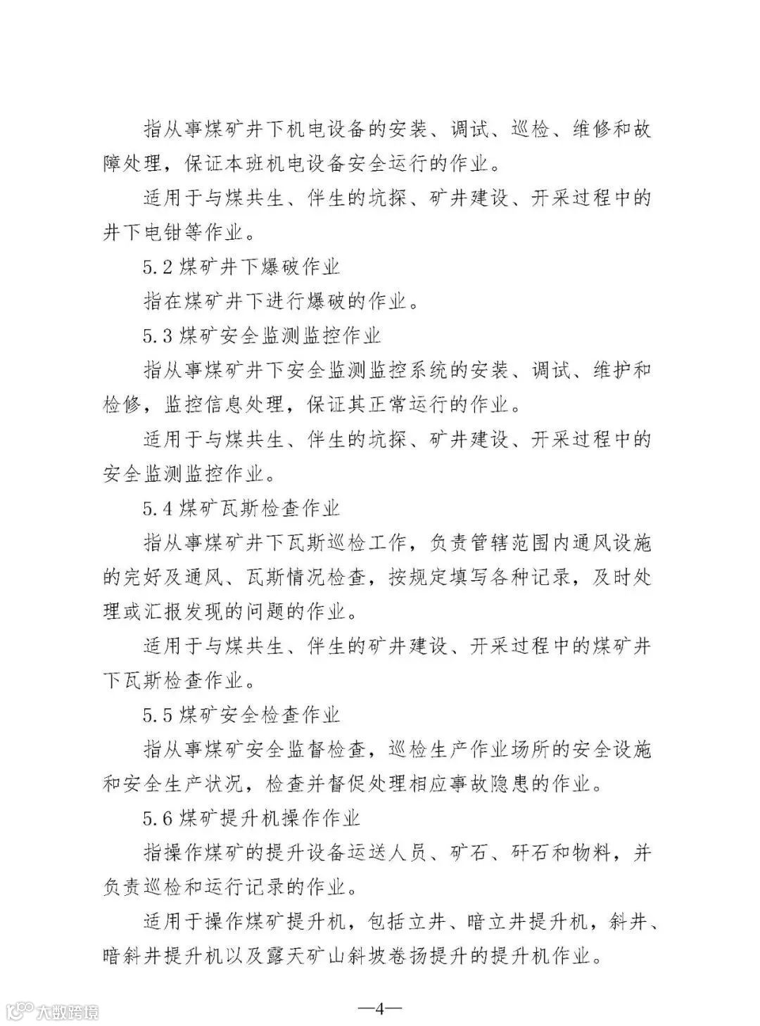 (四)规范了5个作业类别和9个操作项目的文字表述分别是电工作业、高处作业、制冷与空调作业、危险化学品安全作业、烟花爆竹安全作业5个作业类别;煤矿安全作业类别中的“煤矿安全监测监控作业”“煤矿防突作业”“煤矿探放水作业”3个操作项目;金属非金属矿山安全作业类别中的“尾矿作业”“金属非金属矿山提升机操作作业”“金属非金属矿山支护作业”“金属非金属地下矿山主排水作业”4个操作项目;烟花爆竹安全作业类别中的“烟火药制造作业”“黑火药制造作业”2个操作项目。