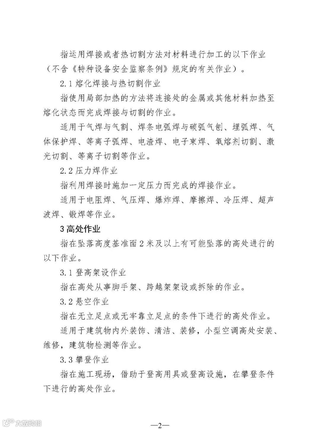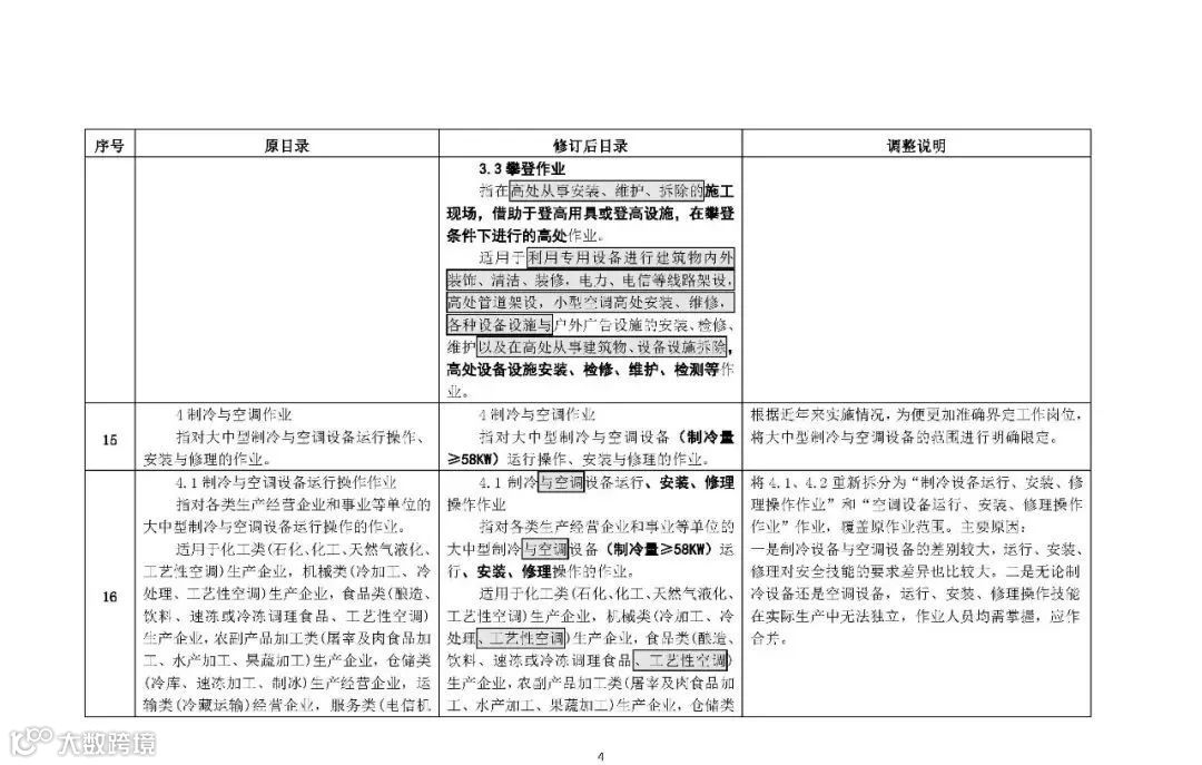 理由:存在高处作业的行业越来越多,作业环境复杂度也在不断增大,通过作业方式区分,并明确适用范围,可覆盖原“高处安装、维护、拆除作业”中6个类别,且便于界定工作岗位,避免重复取证,符合“放管服”要求。
