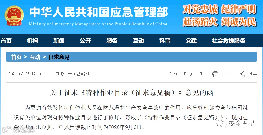 为更加有效发挥特种作业人员在防范遏制生产安全事故中的作用,应急管理部安全基础司组织有关单位对现有特种作业目录进行了修订,形成了 《特种作业目录(征求意见稿)》。2020年,应急管理部安全基础司发布《关于征求《特种作业目录(征求意见稿)》意见的函》 ,向社会公开征求意见。