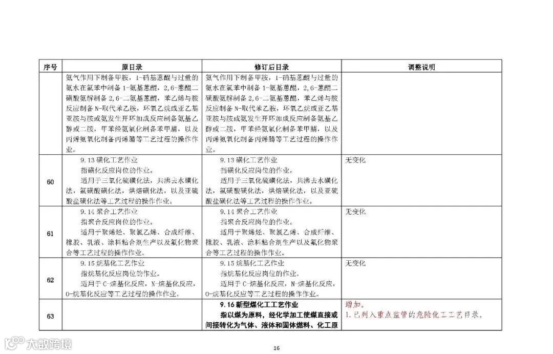 理由: 一是依据原总局《关于公布第二批重点监管危险化工工艺目录和调整首批重点监管危险化工工艺中部分典型工艺的通知》(安监总管三〔2013〕3 号),将“新型煤化工工艺作业” 等3个操作项目纳入目录管理,加上“重点监管危险化学品作业”操作项目及原目录15个危险化工工艺作业,基本涵盖当前危险化工工艺特点; 二是重点监管的危险化学品仓储作业专业性强、安全风险大,对作业人员要求高,需具备健康安全防护、化学品禁忌、应急处置等知识和技能,认真汲取天津港瑞海公司危险化学品仓库“8.12”特大火灾爆炸事故等教训,有必要将危险化学品仓储作业纳入目录,进一步强化安全管理。