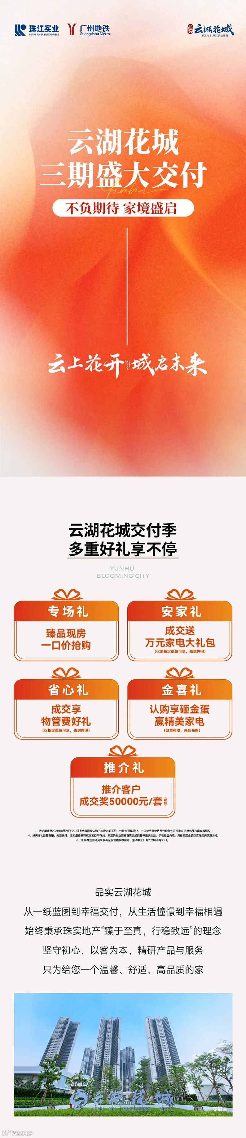 免责声明:1、本宣传资料仅为要约邀请 ,所有文字和图片仅供参考,不作为开发商的销售承诺及要约内容,买卖双方权利义务均以实际签订的商品房合同约定为准。2、本宣传资料对周边环境、政府规划、商业配套、教育资源、地铁、城轨、高速、投资前景等信息为截止于2024年11月的情况,有关介绍仅为提供相关信息,并不作为开发商的销售承诺和要约内容,前述信息可能因政府规划调整及开发商无法控制、预测原因而出现变化,以最新公布的政府文件及相关官方信息为准。3、部分图片来源网络,如有侵权,请联系删除。4、本活动宣传推广细则以各楼盘现场执行政策为准。画面中涉及折扣优惠等以各楼盘现场公示为准。到访/成交礼品数量有限,领完即止。开发商保留对宣传资料更新、修改的权利,敬请留意最新宣传资料。在法律允许范围内,开发商对宣传资料内容拥有解释权。5、本宣传资料对项目周边幼儿园、学校等教育配套资源的介绍旨在提供相关信息,并不意味着本公司对就学安排做出承诺。教育 资源的名称、办学性质、办学规模、学位位置、开学(班)时间、招 生条件、收费标准、及招生区域存在调整的可能,应以教育主管部门及办学方颁布的政策规定为准。6.本宣传资料解释权,在相关法律范围内归广州珠实地产有限公司及旗下项目开发商所有。宣传资料制作时间:2024年11月。