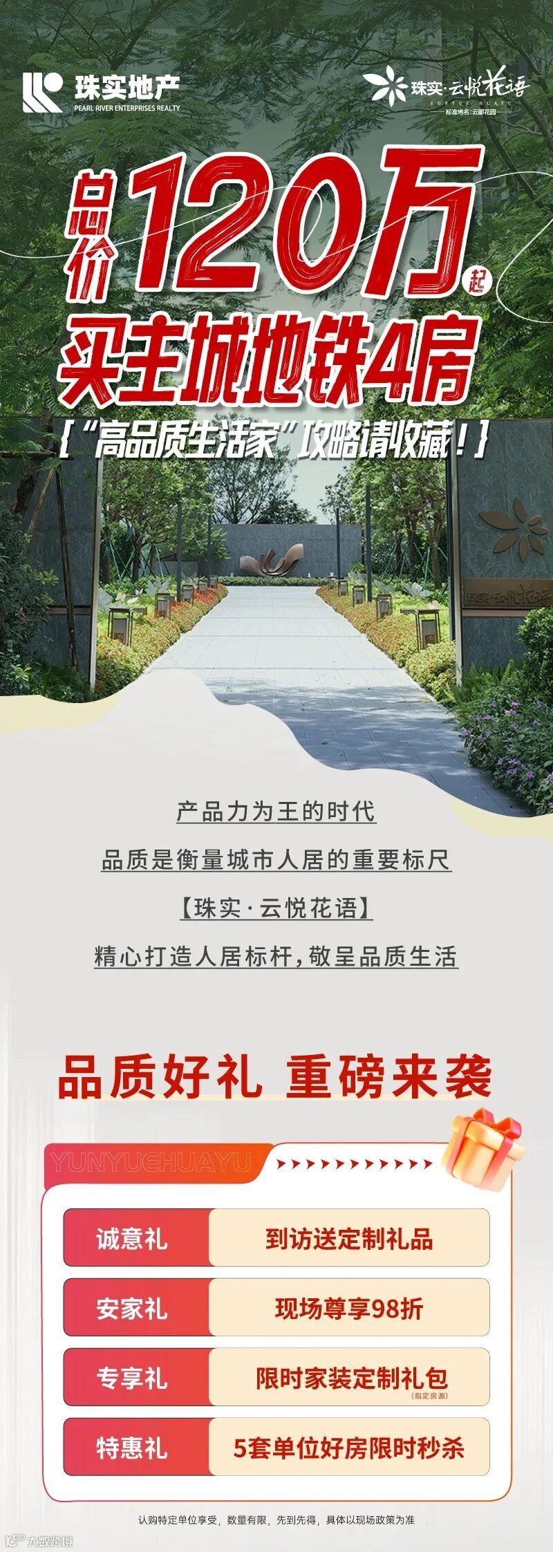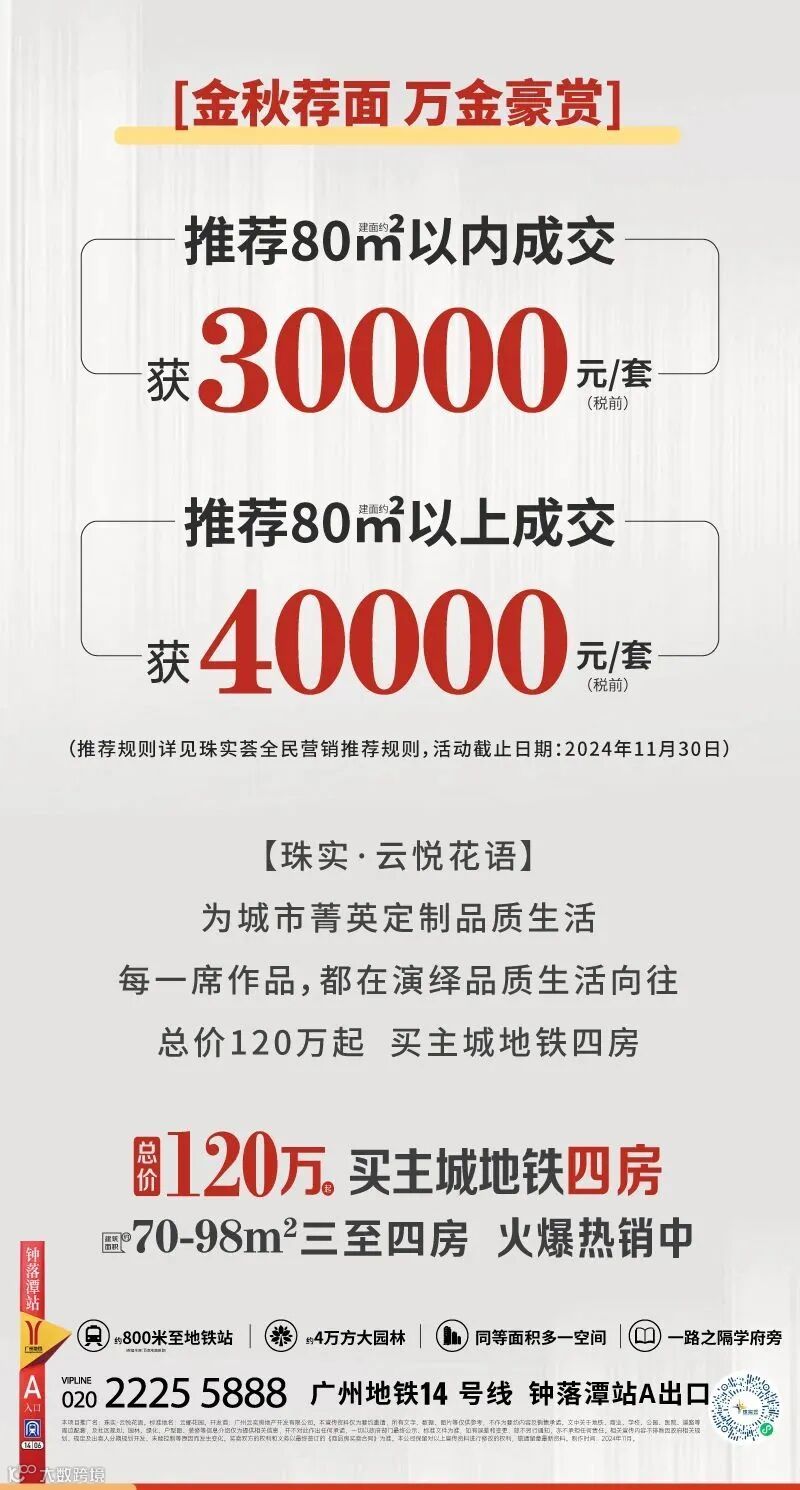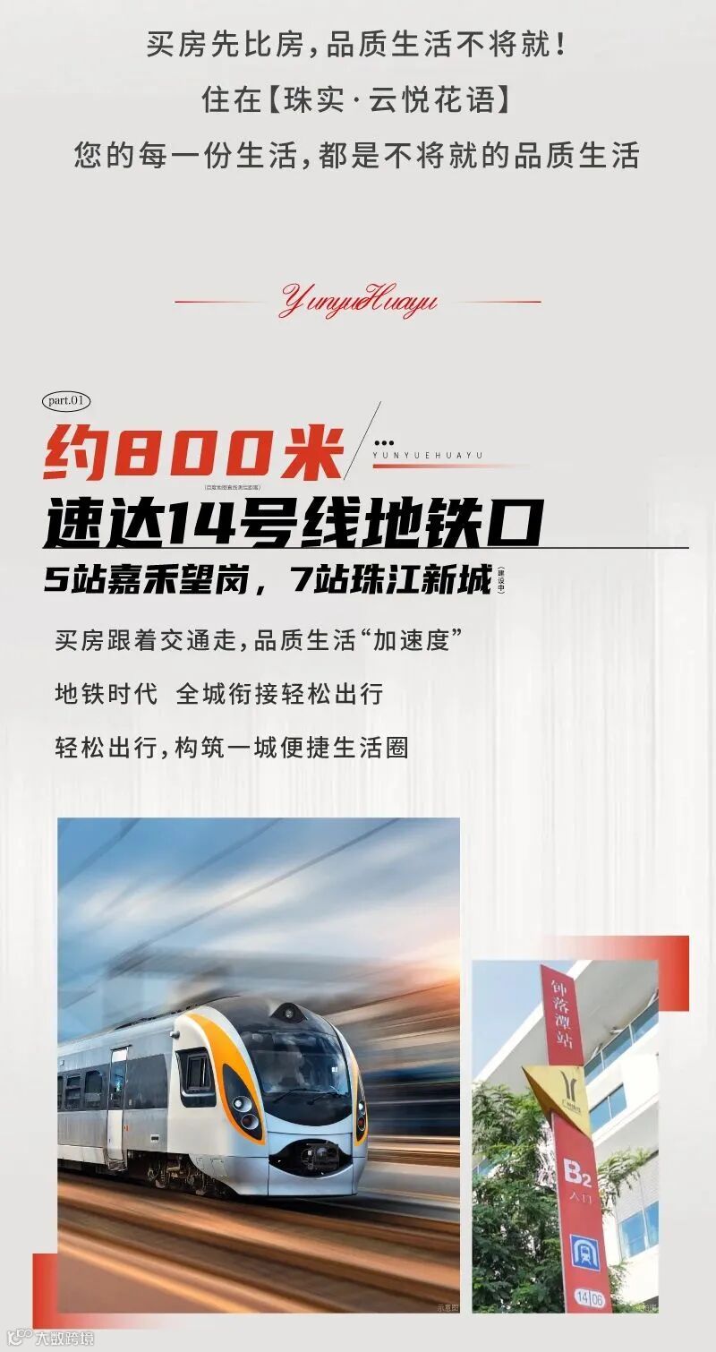 免责声明:1、本宣传资料仅为要约邀请 ,所有文字和图片仅供参考,不作为开发商的销售承诺及要约内容,买卖双方权利义务均以实际签订的商品房合同约定为准。2、本宣传资料对周边环境、政府规划、商业配套、教育资源、地铁、城轨、高速、投资前景等信息为截止于2024年11月的情况,有关介绍仅为提供相关信息,并不作为开发商的销售承诺和要约内容,前述信息可能因政府规划调整及开发商无法控制、预测原因而出现变化,以最新公布的政府文件及相关官方信息为准。3、部分图片来源网络,如有侵权,请联系删除。4、本活动宣传推广细则以各楼盘现场执行政策为准。画面中涉及折扣优惠等以各楼盘现场公示为准。到访/成交礼品数量有限,领完即止。开发商保留对宣传资料更新、修改的权利,敬请留意最新宣传资料。在法律允许范围内,开发商对宣传资料内容拥有解释权。5、本宣传资料对项目周边幼儿园、学校等教育配套资源的介绍旨在提供相关信息,并不意味着本公司对就学安排做出承诺。教育 资源的名称、办学性质、办学规模、学位位置、开学(班)时间、招 生条件、收费标准、及招生区域存在调整的可能,应以教育主管部门及办学方颁布的政策规定为准。6.本宣传资料解释权,在相关法律范围内归广州珠实地产有限公司及旗下项目开发商所有。宣传资料制作时间:2024年11月。
