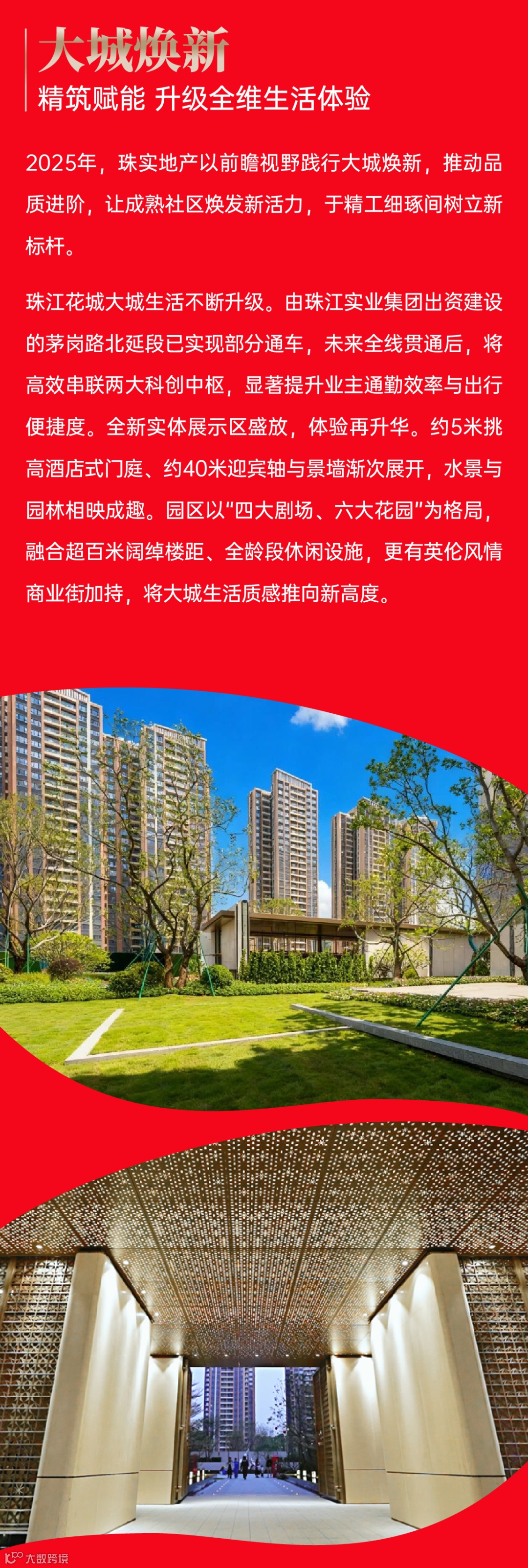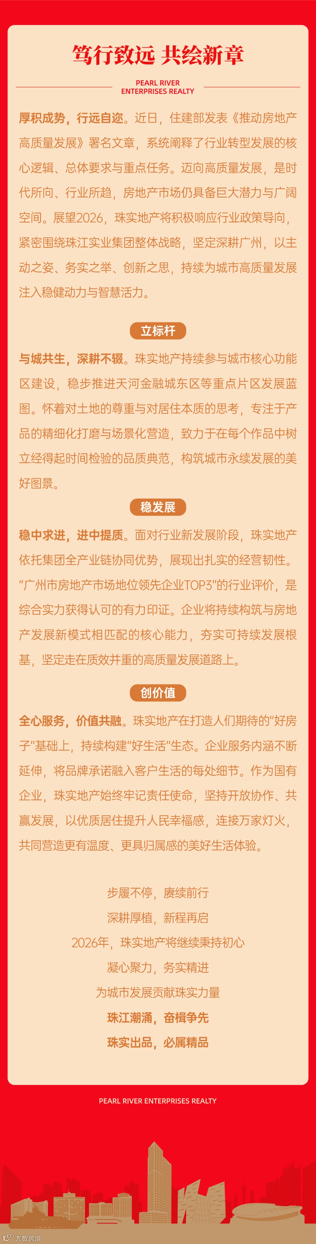 免责声明:1、本宣传资料仅为要约邀请,所有文字和图片仅供参考,不作为开发商的销售承诺及要约内容,买卖双方权利义务均以实际签订的商品房合同约定为准。2、本宣传资料对周边环境、政府规划、商业配套、教育资源、地铁、城轨、高速、投资前景等信息为截止于2026年1月的情况,有关介绍仅为提供相关信息,并不作为开发商的销售承诺和要约内容,前述信息可能因政府规划调整及开发商无法控制、预测原因而出现变化,以最新公布的政府文件及相关官方信息为准。3、本宣传资料对项目周边幼儿园、学校等教育配套资源的介绍旨在提供相关信息,并不意味着本公司对就学安排做出承诺。教育资源的名称、办学性质、办学规模、学位位置、开学(班)时间、招生条件、收费标准及招生区域存在调整的可能,应以教育主管部门及办学方颁布的政策规定为准。4、本宣传资料解释权,在相关法律范围内归广州珠实地产有限公司及旗下项目开发商所有。宣传资料制作时间:2026年1月。