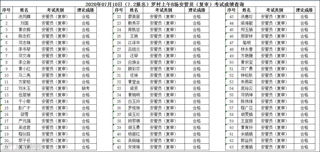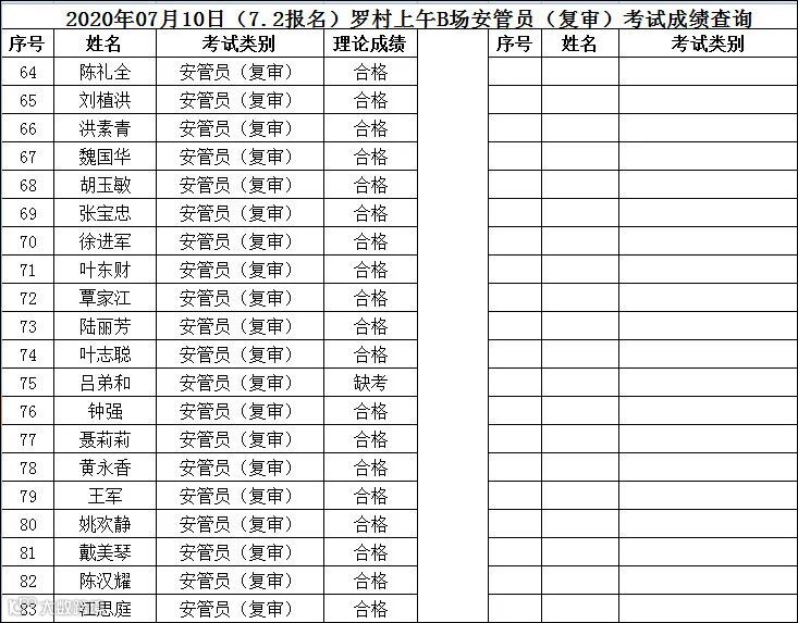 2020.07.10(7.2报名)罗村上午B场安管员(复审)考试成绩